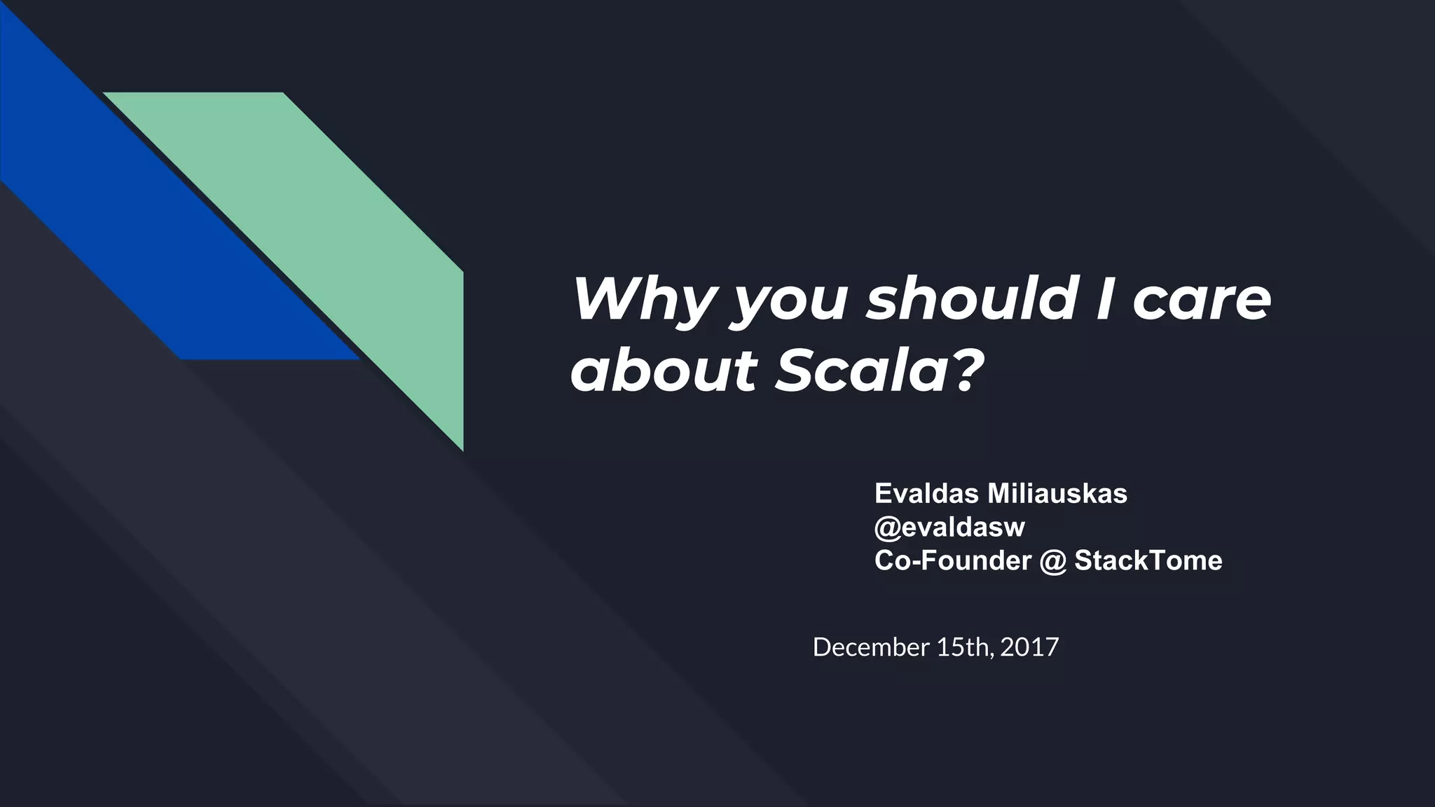 The document discusses why Scala is an interesting language to learn, especially for working with data. It notes that Scala combines functional programming and object-oriented concepts, runs on the JVM, and its features like immutability and pattern matching make it well-suited for data processing. The document also highlights trends around data engineering and increasing amounts of data that will need to be managed.