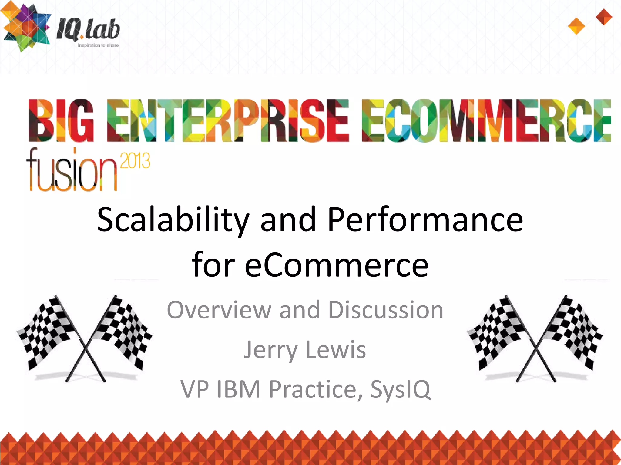 Jerry Lewis, VP of an IBM practice, discusses website performance and scalability for eCommerce. He shares horror stories of performance issues causing major revenue losses and customer complaints. Website performance is important because slow sites hurt sales and customer experience. Common causes of bad performance include inefficient code, database issues, and third party integration problems. To achieve good performance, websites must be designed with performance in mind from the start, with strategies like caching, efficient database usage, and infrastructure tuning.