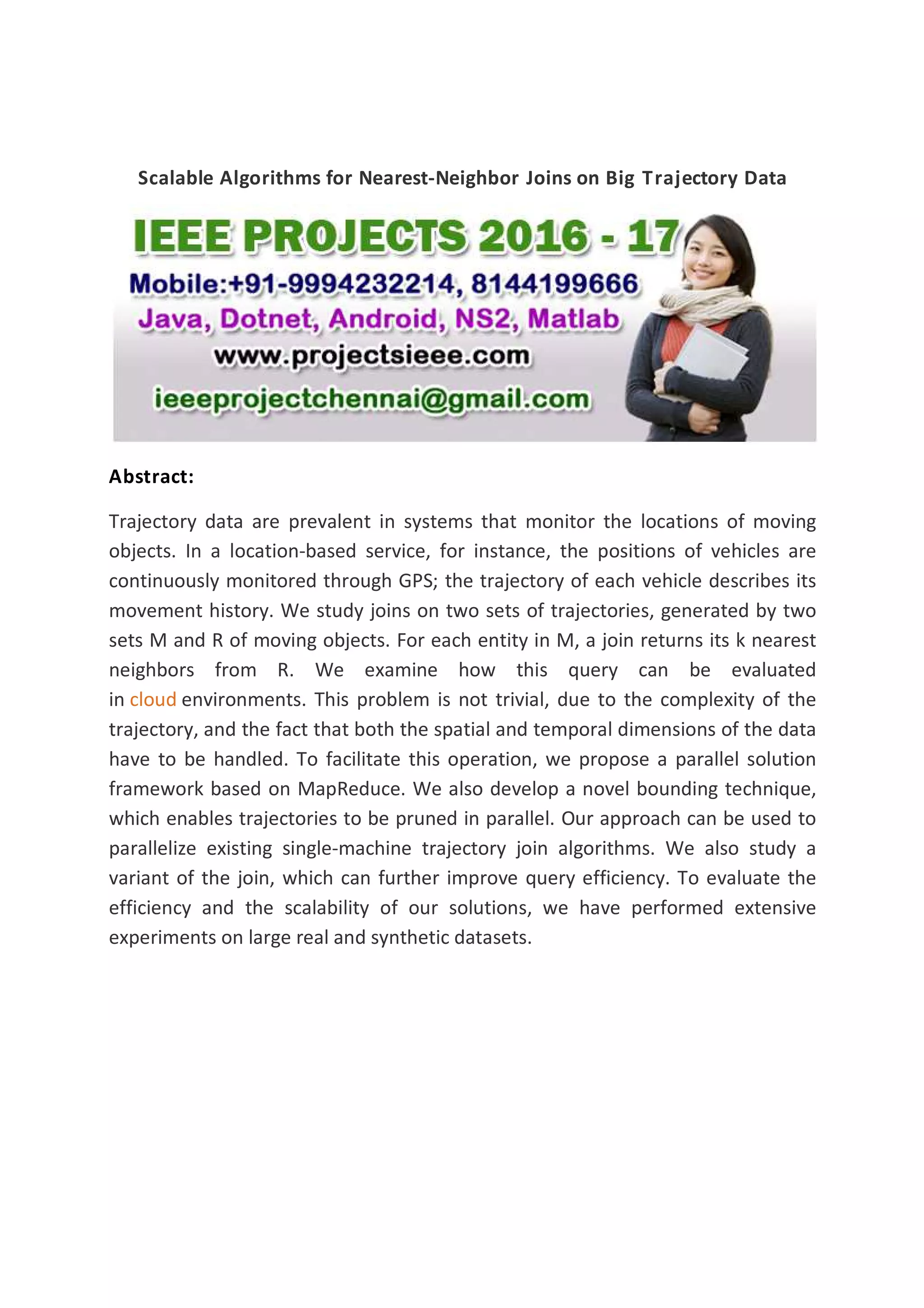 The document discusses scalable algorithms for nearest-neighbor joins on extensive trajectory data, particularly in cloud environments. It proposes a parallel solution framework using MapReduce and introduces a novel bounding technique for efficient trajectory pruning. The authors evaluate their approach through extensive experiments, demonstrating improved query efficiency and scalability.