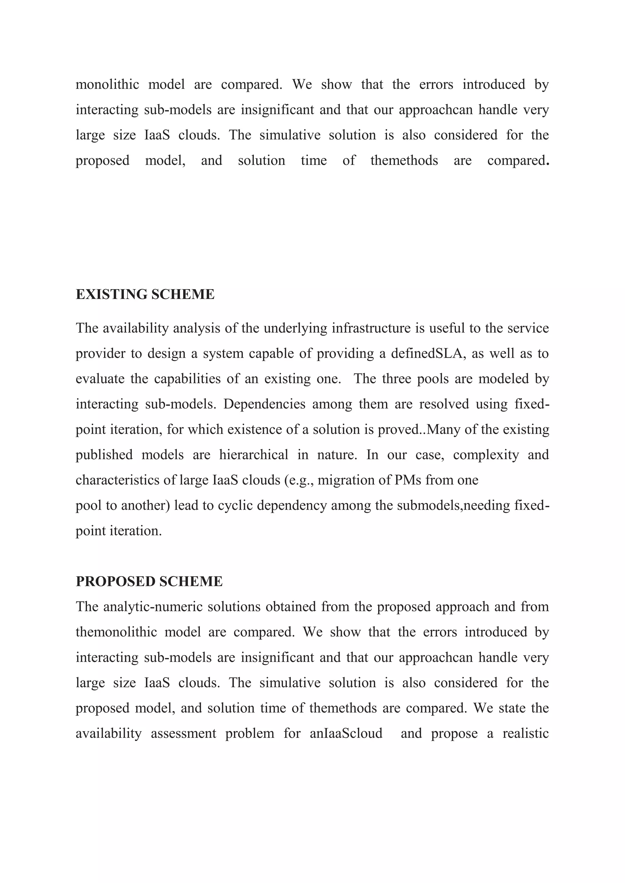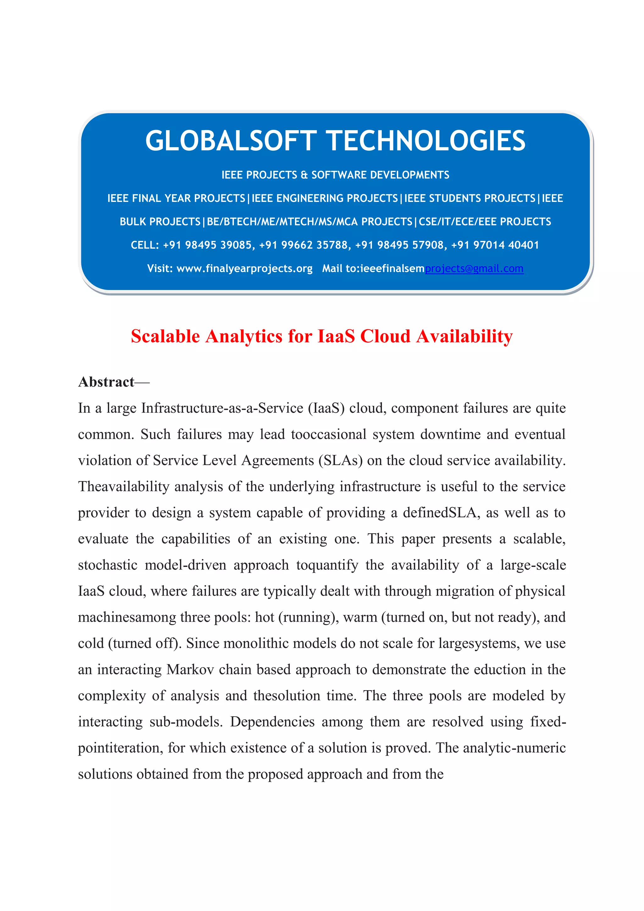 The document discusses a scalable, stochastic modeling approach for analyzing the availability of large-scale Infrastructure-as-a-Service (IaaS) clouds, addressing common component failures that can violate service level agreements (SLAs). It introduces an interacting Markov chain-based method to reduce analysis complexity, using fixed-point iteration to resolve dependencies among sub-models. The proposed model is shown to effectively handle large IaaS clouds, providing cloud service providers with valuable insights for system design and operational tuning to meet availability SLAs.