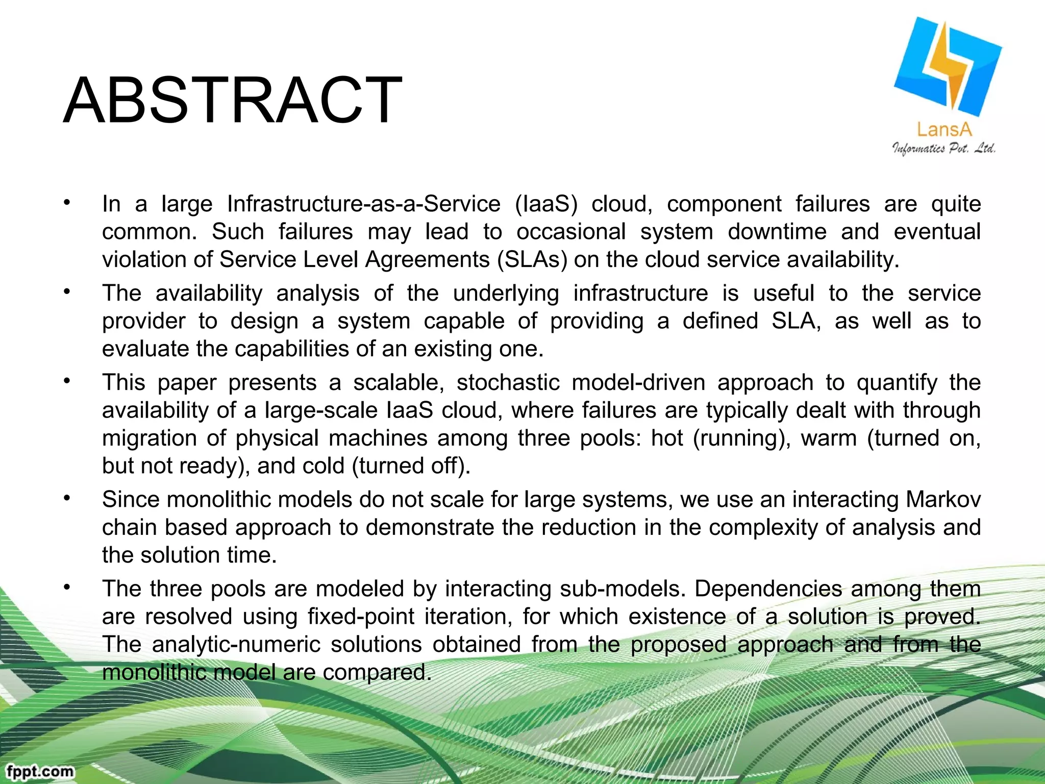 This document presents a scalable approach to quantify availability in large-scale Infrastructure as a Service (IaaS) clouds. It models component failures using three pools - hot, warm, and cold. Dependencies between pools are resolved using fixed-point iteration. It compares analytic-numeric solutions from the proposed interacting Markov chain approach to monolithic models. The document also discusses optimizing data replication in clouds to minimize violations of applications' quality of service requirements. It formulates the problem as an integer program and proposes transforming it to a minimum-cost maximum-flow problem to find optimal solutions efficiently.