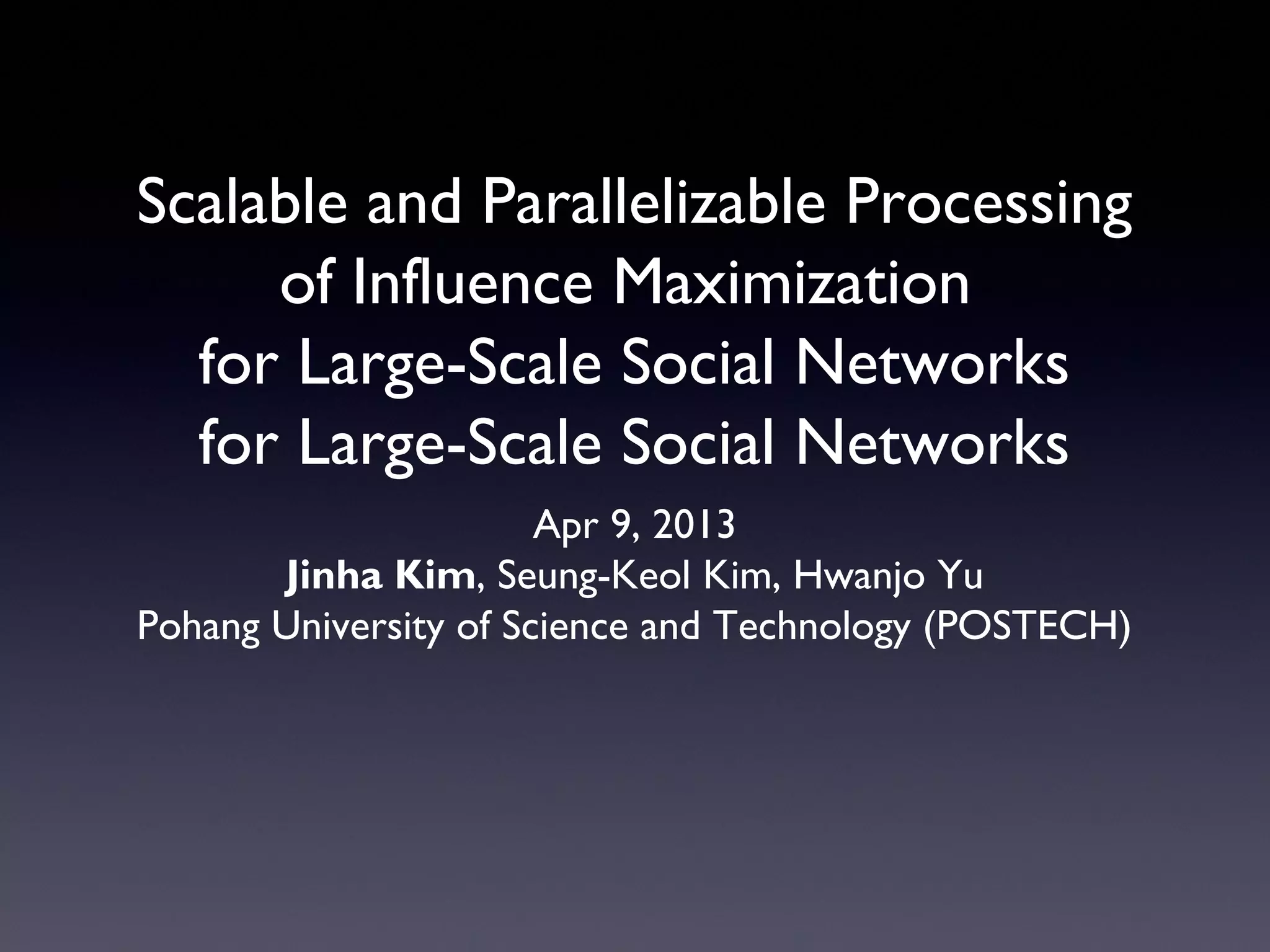 This document discusses an algorithm called IPA (Influence Path Algorithm) for efficiently solving the influence maximization problem in large social networks. IPA works by extracting meaningful influence paths between node pairs from the graph and evaluating influence in parallel by approximating the influence spread of individual nodes. An empirical evaluation on real datasets shows IPA can process influence maximization much faster than other algorithms while achieving comparable influence spread results.