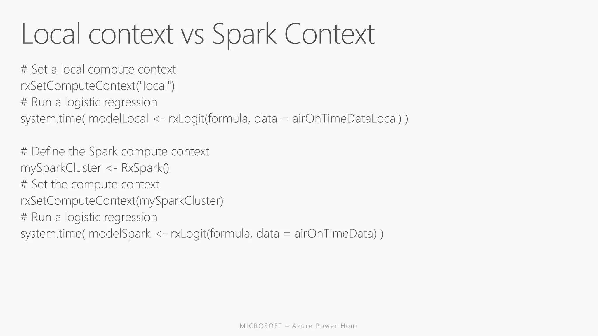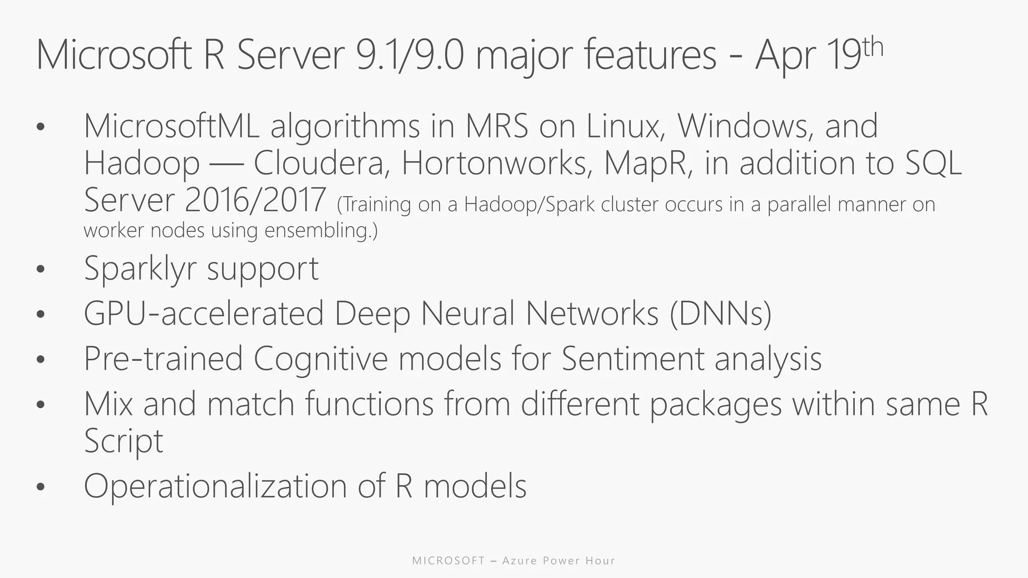 The document discusses the features and capabilities of R, a popular open-source statistical programming language used for data analysis and visualization, which is supported by a vast community and numerous packages. It outlines the integration of R with Azure services, including Azure Compute and Spark, and details specific functions for processing and analysis. Additionally, it provides links to resources for further learning and implementation of R in cloud environments.