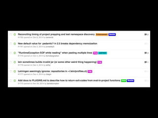 This document discusses scalable ways of doing open source work. It outlines how ClojureWerkz grew from 4 projects and 2 maintainers in 2011 to over 30 projects and 70 contributors by 2015. It emphasizes the importance of maintaining responsibility to users by having good documentation, communication channels, and processes to engage contributors and ensure projects don't become abandonware. Standardizing practices, automating tasks, and writing documentation throughout development can help projects scale sustainably.