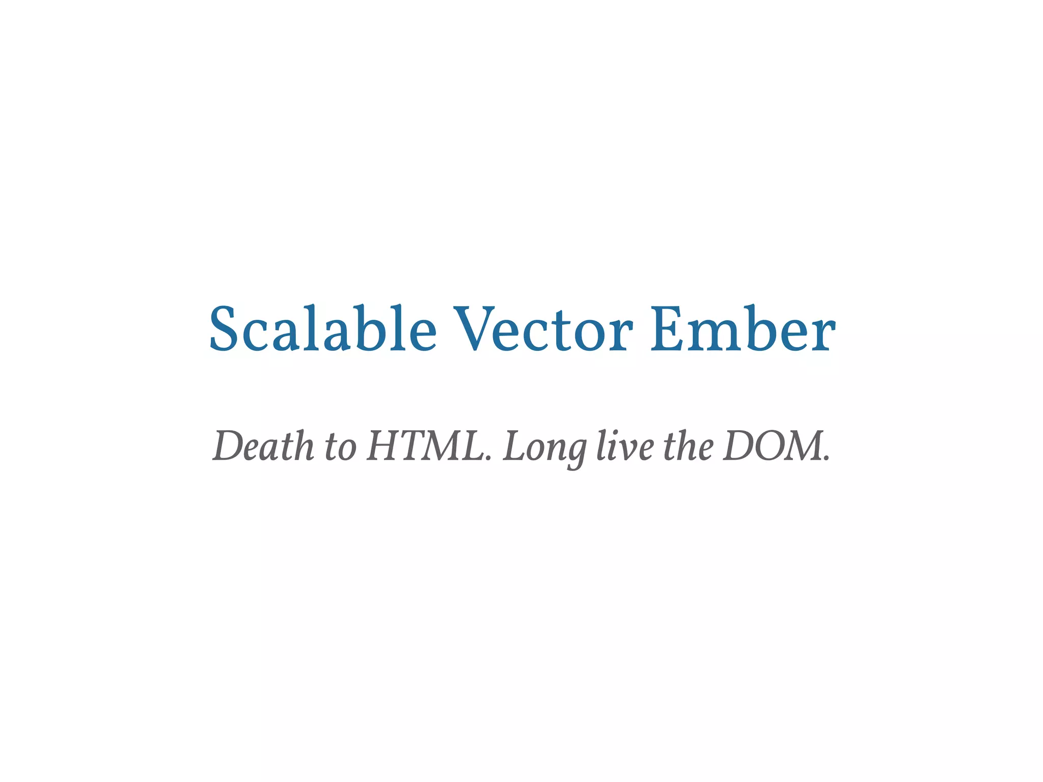 This document discusses the history and benefits of Scalable Vector Graphics (SVG) and how SVG rendering has evolved in Ember.js. It explains that SVG was standardized by the W3C in 1998 in response to competing vector formats. Benefits of SVG include small file sizes, arbitrary resolution, and ability to include metadata, links and animation. The document then summarizes the evolution of how Ember renders templates, moving from rendering templates as strings to directly manipulating the DOM with objects like HTMLBars. It discusses challenges of managing namespaces and contexts when rendering templates directly to the DOM.
