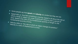 This document discusses different types of physical quantities in mechanics. It defines a physical quantity as something that can be measured, and explains that all quantities are either scalar or vector quantities. Scalar quantities have only magnitude, like time, length, and speed in a single direction. Vector quantities have both magnitude and direction, like displacement, velocity, and acceleration. Examples are provided to illustrate the difference between speed and velocity. Common scalar and vector quantities are listed.