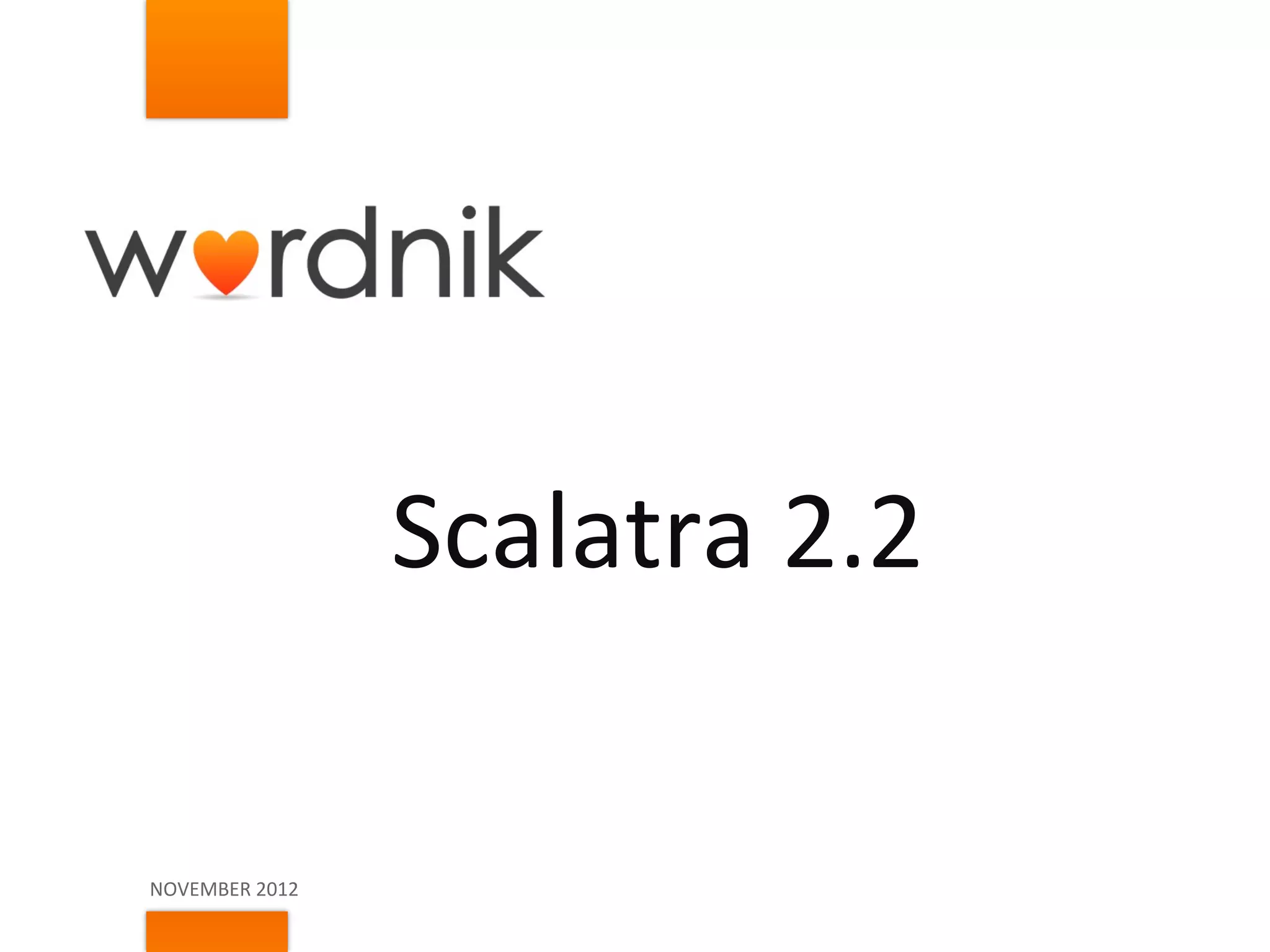 This document provides an overview and introduction to Scalatra 2.2, including new features such as routing, parameters, JSON4s integration, Akka integration, and Atmosphere integration. It demonstrates the basics of defining routes and actions in Scalatra, and how to work with requests, responses, and rendering results. Advanced routing topics like parameters, splats, and regular expressions are also covered.