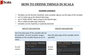 Scala is a statically typed programming language that integrates object-oriented and functional programming concepts while running on JVM. It features interoperability with Java, reduces boilerplate code through type inference, and supports various programming constructs such as loops and pattern matching. Scala collections are rich, distinguishing between mutable and immutable types, offering a flexible approach to data management and organization.