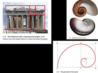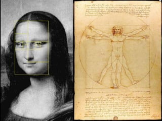 This document discusses size, scale, and proportion in art. It defines scale as the comparative size of elements in relation to other elements or objects. Proportion is defined as the relationship between the sizes of parts and the whole. The document discusses classical proportions like the Golden Rectangle and Golden Section, which are ratios used in art. It also discusses Vitruvian Man, in which Leonardo da Vinci illustrated the harmonious proportions of the human body. The document notes that while Vitruvius defined average body proportions, there is variability between individuals.