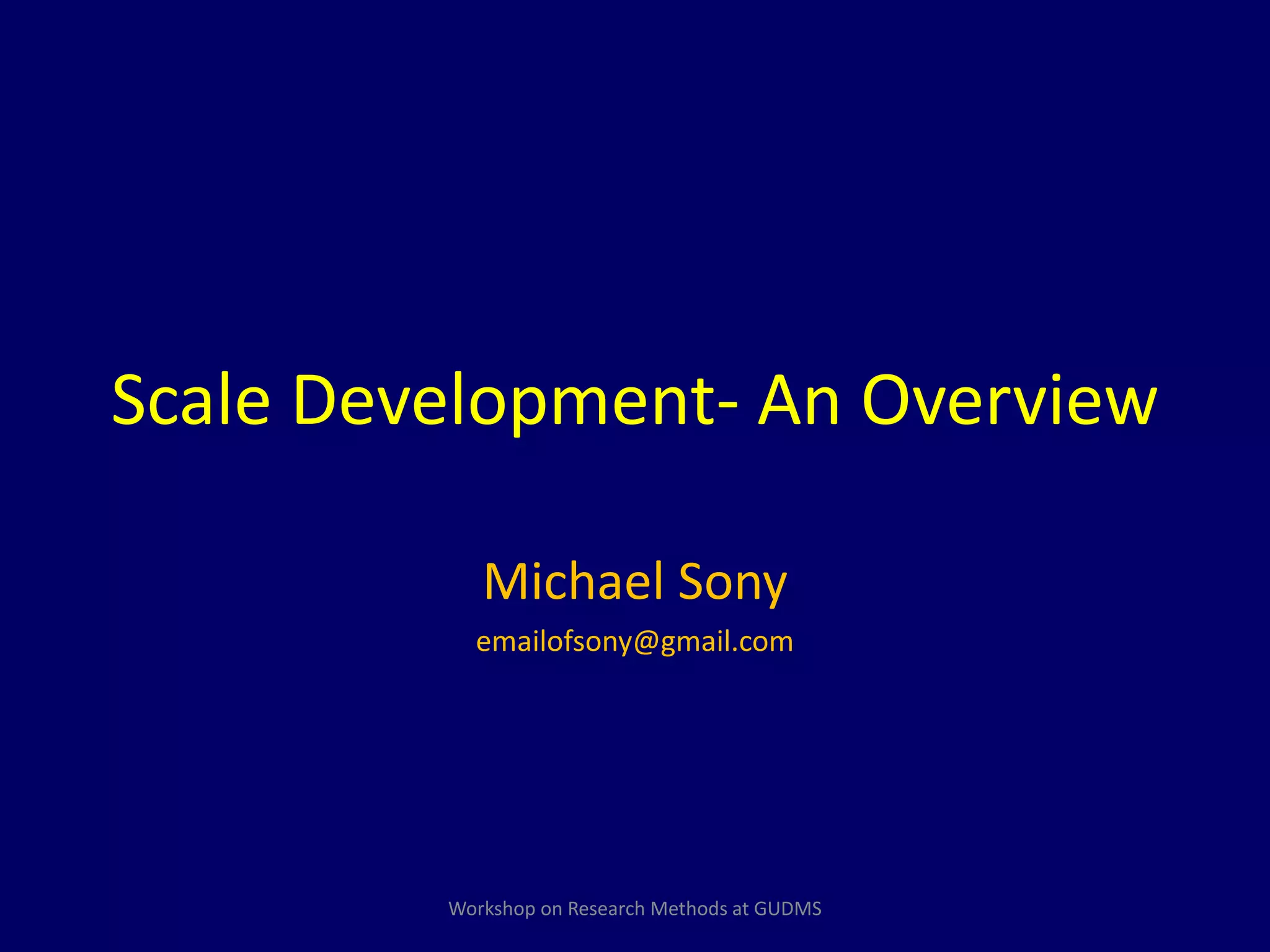 This document discusses the process of scale development. It outlines key steps in scale development including construct definition, item generation, content validity testing, measurement purification through techniques like exploratory factor analysis, and verification of dimensionality through assessing convergent and discriminant validity. It provides examples and guidelines for each step to help ensure a rigorous process for developing a valid and reliable measurement scale.