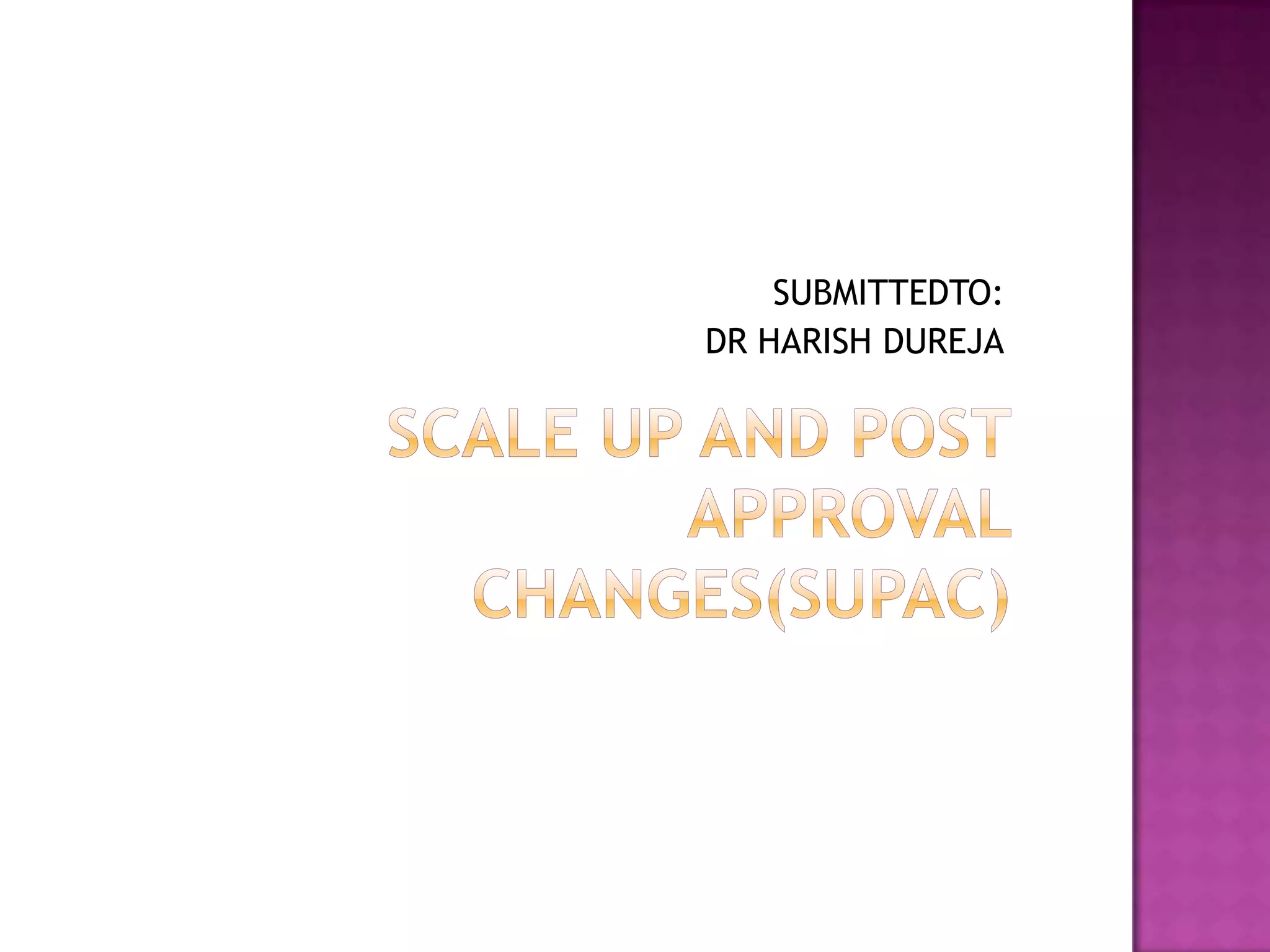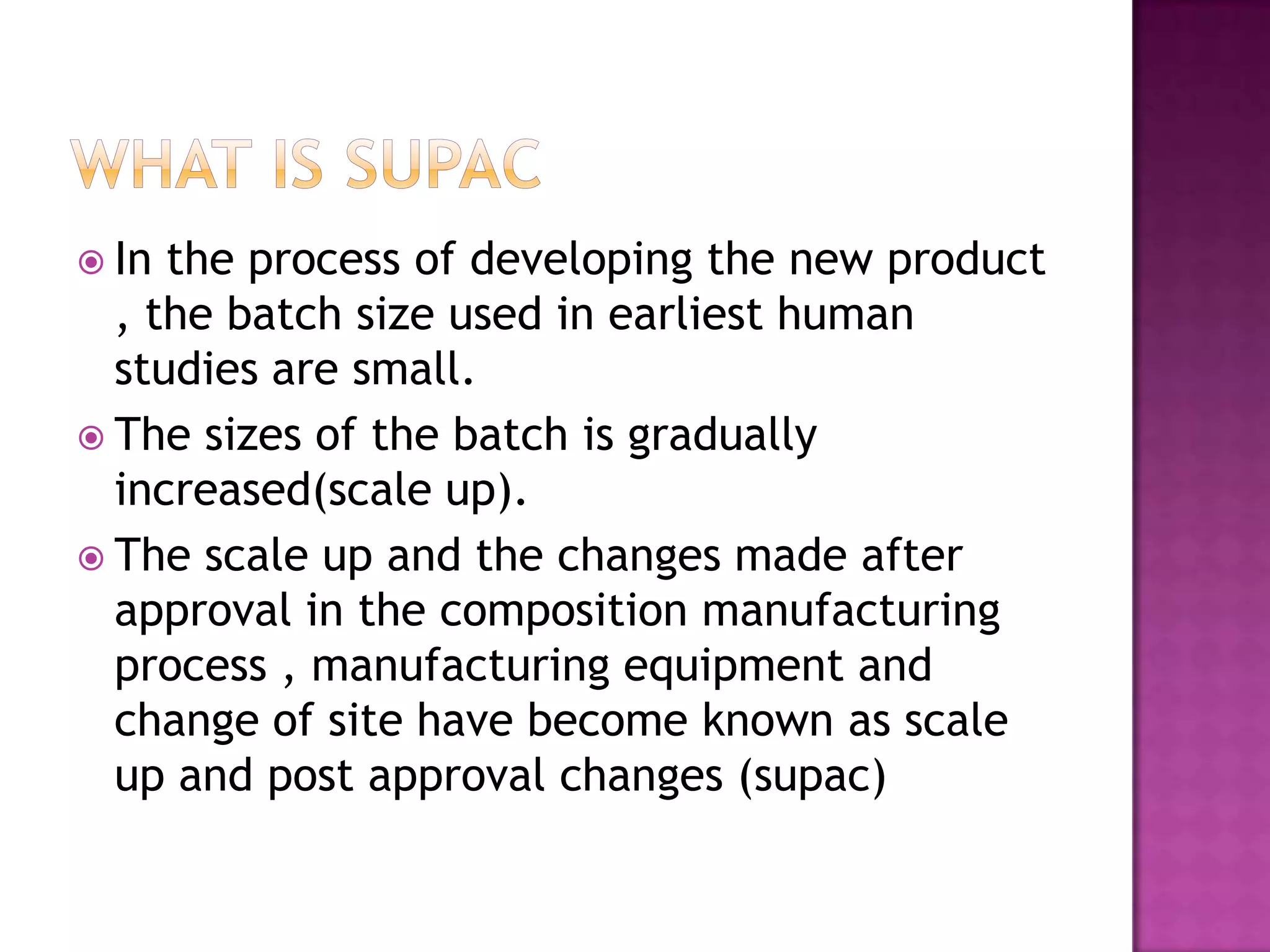 The document discusses guidelines for post-approval changes to drug products, including changes to batch size, manufacturing sites and equipment, and composition. It outlines 3 levels of changes - minor, moderate, and major - and provides recommendations for documentation and regulatory filings required for each level of change. Major changes, such as a new manufacturing site or changes in the amount of active ingredients, require more extensive documentation including stability testing and possibly bioequivalence studies.