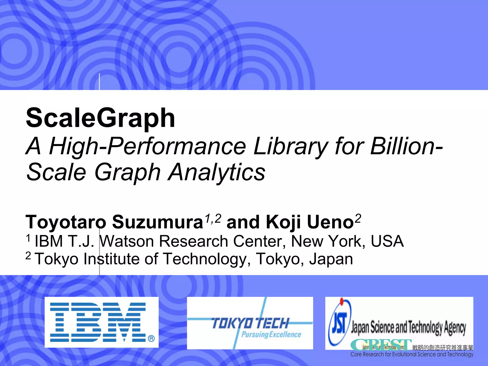 The document presents ScaleGraph, an open-source library designed for high-performance analytics on large-scale graphs with billions of vertices and edges. It discusses the programming models, optimizations, and algorithms supported by the library, emphasizing its efficiency in distributed and many-core environments. Key features include memory management, communication optimizations, and a focus on ease of use across different programming languages.