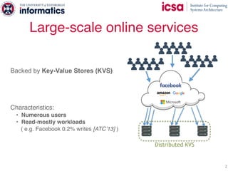 The document discusses the challenges and solutions of scaling distributed key-value stores (KVS) by implementing a hybrid model called scale-out ccNUMA, which integrates symmetric caching to balance loads while maintaining consistency. It highlights issues related to skewed access distribution leading to performance bottlenecks and presents caching strategies that improve system throughput by distributing hot objects effectively across nodes. The proposed methods show significant performance improvements, achieving up to three times the throughput compared to traditional systems while ensuring strong consistency guarantees.