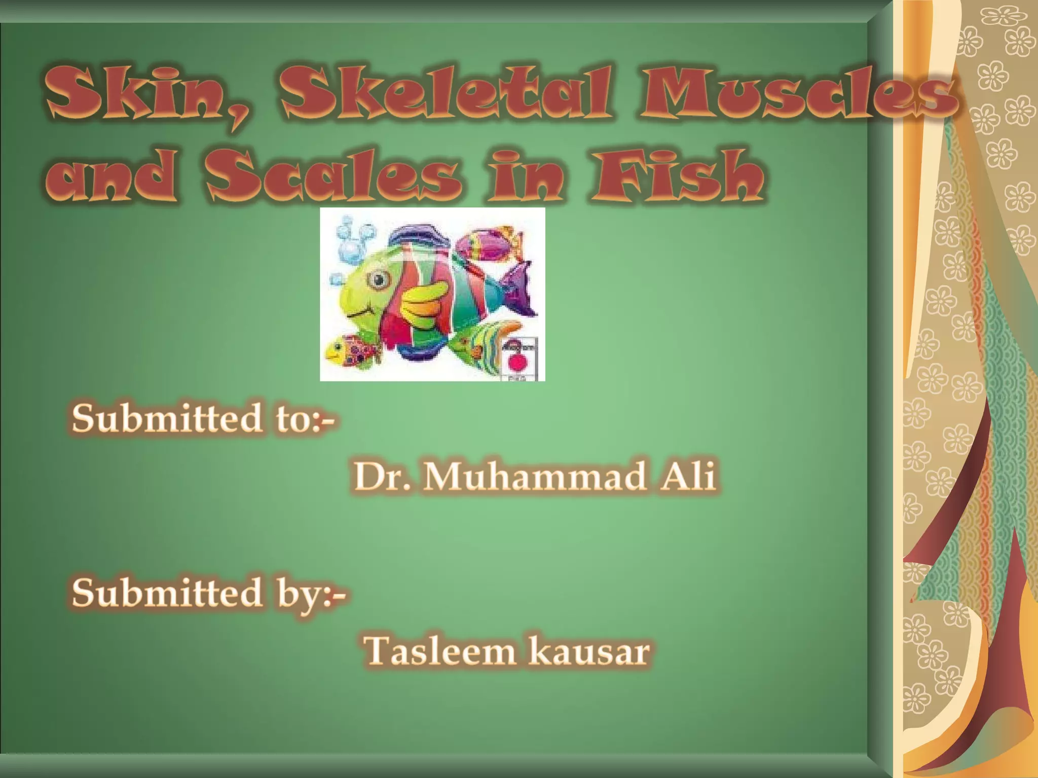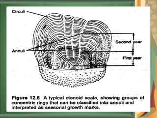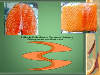 The document summarizes key aspects of fish skin and scales as well as skeletal muscles. It describes the main types of scales found in fish like ganoid, leptoid, placoid and cosmoid scales, and how they can vary in size and structure between species and sexes. The functions of scales and skin are outlined. Skeletal muscles are described including muscle fiber anatomy, sarcomere structure, sliding filament model of contraction, and how nerves stimulate muscles via the neuromuscular junction and motor units.
