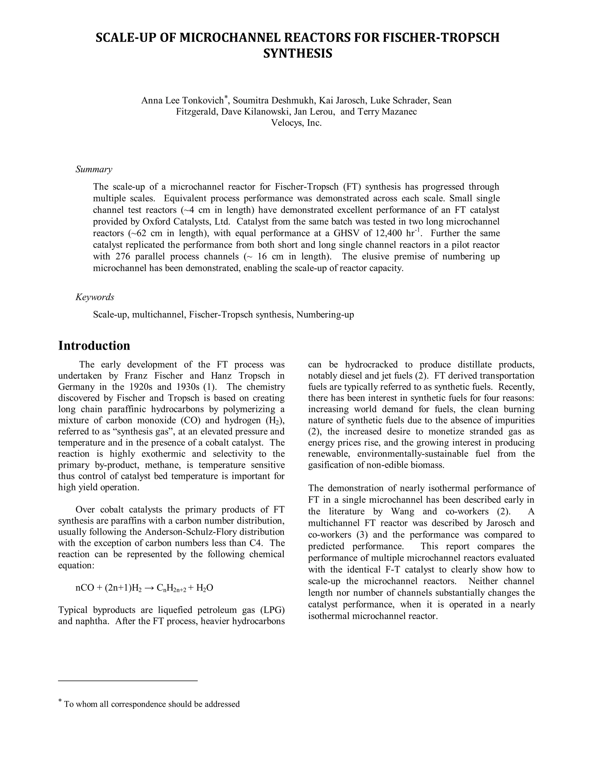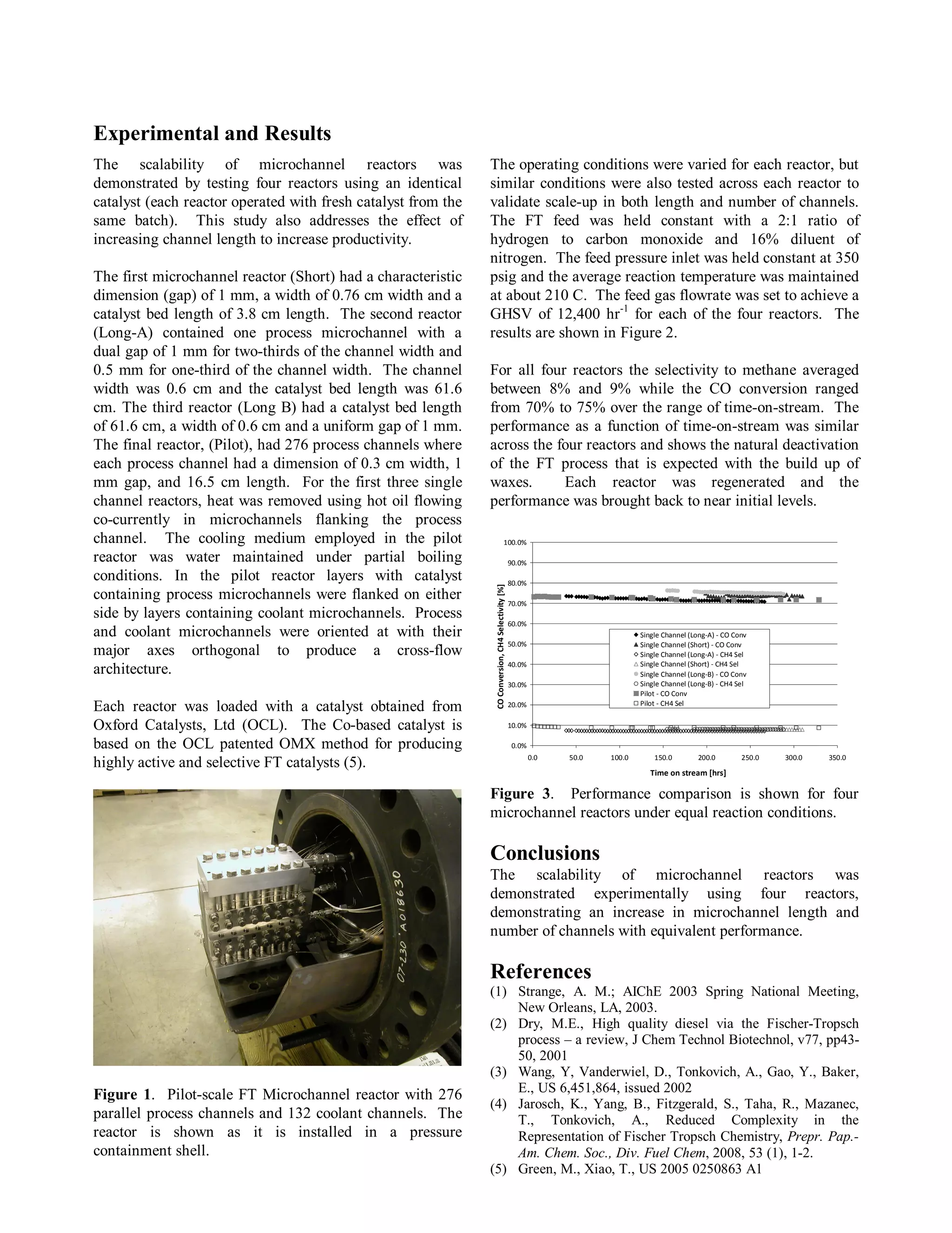 The scale-up of microchannel reactors for Fischer-Tropsch synthesis has been demonstrated through multiple scales with equivalent performance. Small single channel reactors and larger reactors with 276 parallel channels showed consistent CO conversion rates of 70-75% and methane selectivity of 8-9% when tested with the same catalyst under identical conditions. This confirms that microchannel reactor performance is unaffected by increasing channel length or number of channels, enabling scale-up while maintaining nearly isothermal conditions ideal for Fischer-Tropsch synthesis.