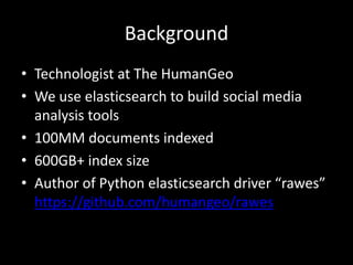 This document summarizes how Elasticsearch can be used for scaling analytics applications. Elasticsearch is an open source, distributed search and analytics engine that can index large volumes of data. It automatically shards and replicates data across nodes for redundancy and high availability. Analytics queries like date histograms, statistical facets, and geospatial searches can retrieve insightful results from large datasets very quickly. The document provides an example of using Elasticsearch to perform sentiment analysis, location tagging, and analytical queries on over 100 million social media documents.