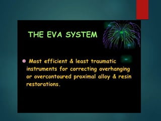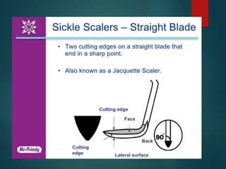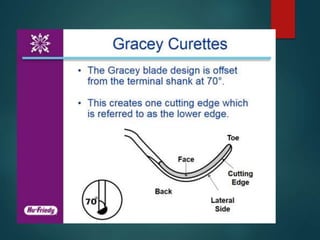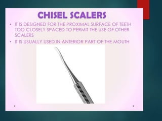 This document discusses different types of periodontal instruments and their uses. It describes five main classifications of instruments: periodontal probes, explorers, scaling/root planing/curettage instruments, periodontal endoscopes, and cleansing/polishing instruments. Specific instruments are discussed in detail within each classification, including their parts, designs, uses, and benefits. Gracey curettes, sickle scalers, hoe scalers, files, and ultrasonic instruments are some of the instruments explained in the document.