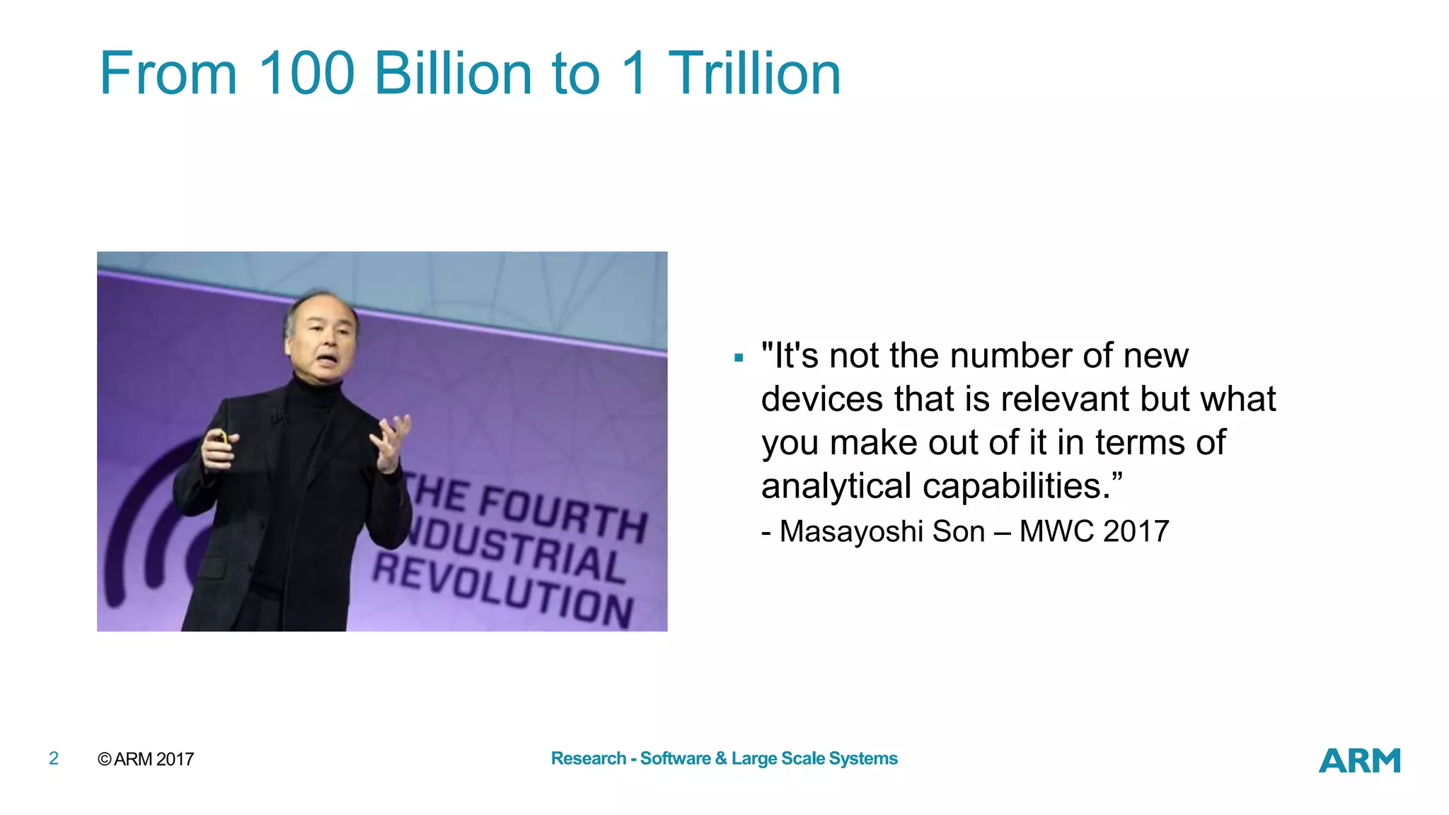 This document discusses scaling computing from one core to one trillion cores using ARM architecture. It outlines ARM's research areas for developing serverless hardware and software to efficiently handle large volumes of data from internet-of-things sensors. The goal is to transform infrastructure through more intelligent, flexible cloud architectures using workload-optimized data centers from the edge to the core. Key research focuses on scheduling events efficiently and programming smart accelerators to process and pipeline data from little data to big data.
