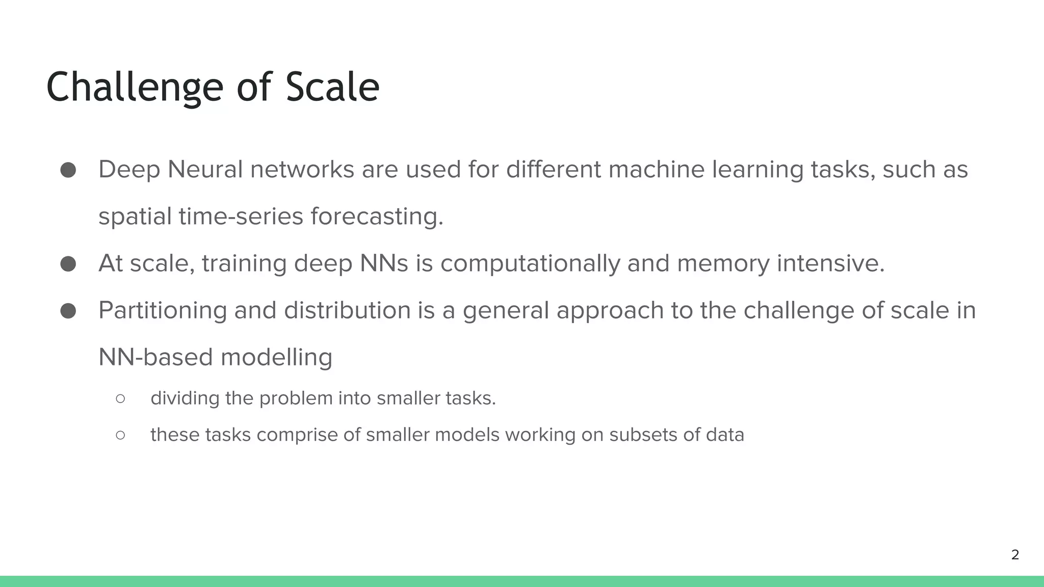 The document discusses challenges in scaling deep learning models for spatial time-series forecasting, specifically emphasizing the computational intensity of training deep neural networks. It proposes partitioning and distribution as effective strategies for managing large datasets from traffic sensors, including the creation of directed weighted graphs for data representation. Key research questions include how to partition data while preserving dependencies and optimizing forecast accuracy, with results showing that partition-based models significantly reduce prediction errors compared to single sensor models.