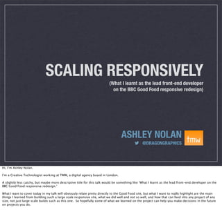 This document summarizes a talk given by Ashley Nolan about lessons learned as the lead front-end developer on the BBC Good Food responsive redesign project. Some key points discussed include researching existing patterns before designing their own, sketching and prototyping interactions early, and interchanging components responsively. Working on such a large-scale, high-traffic site was intimidating but a great learning experience for the speaker.