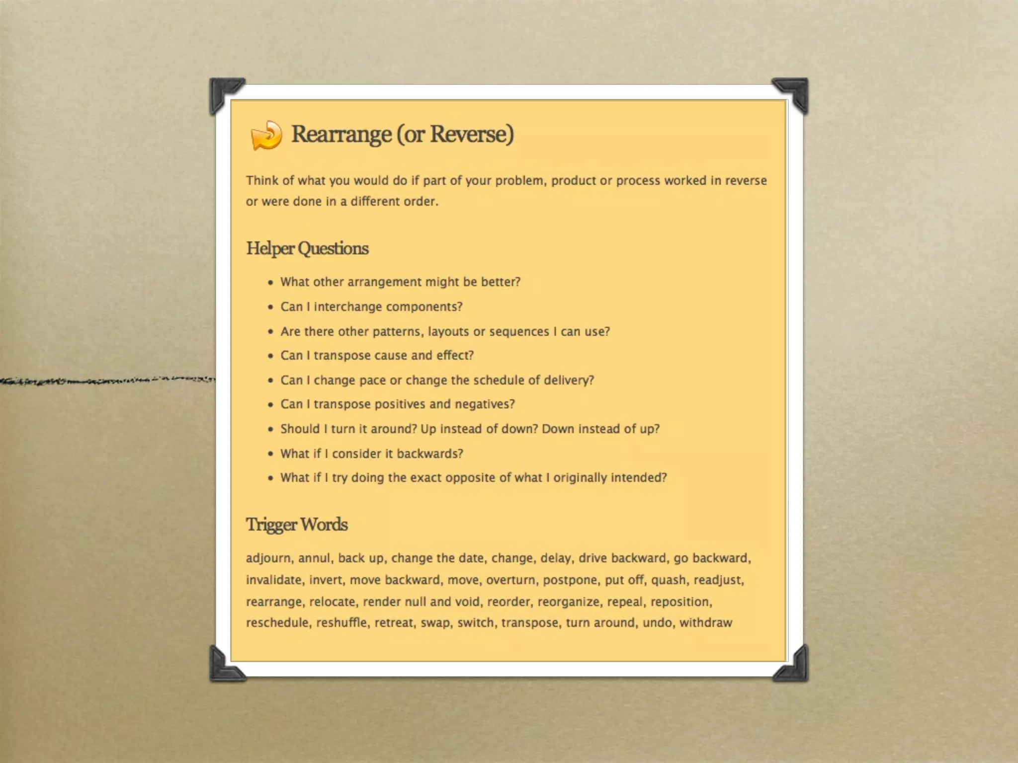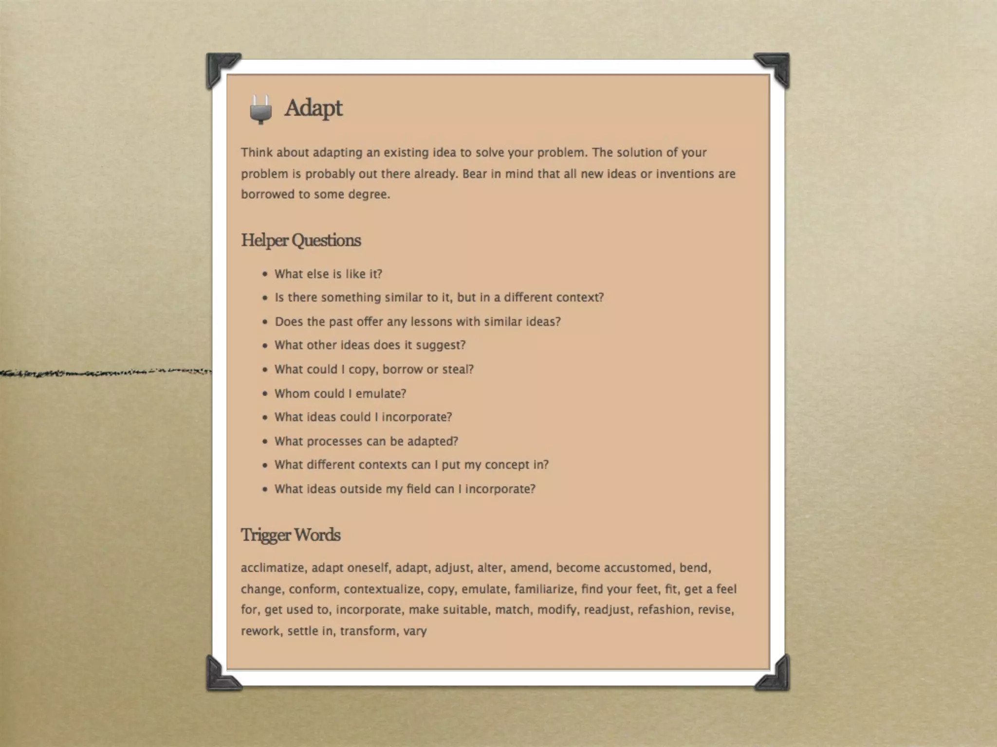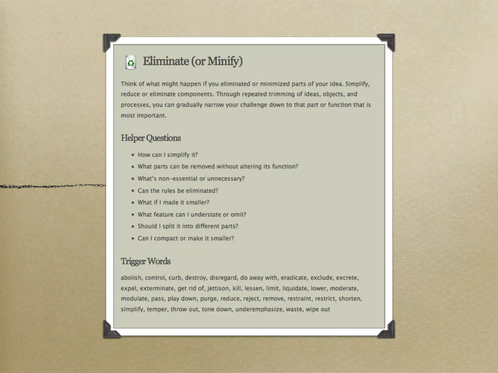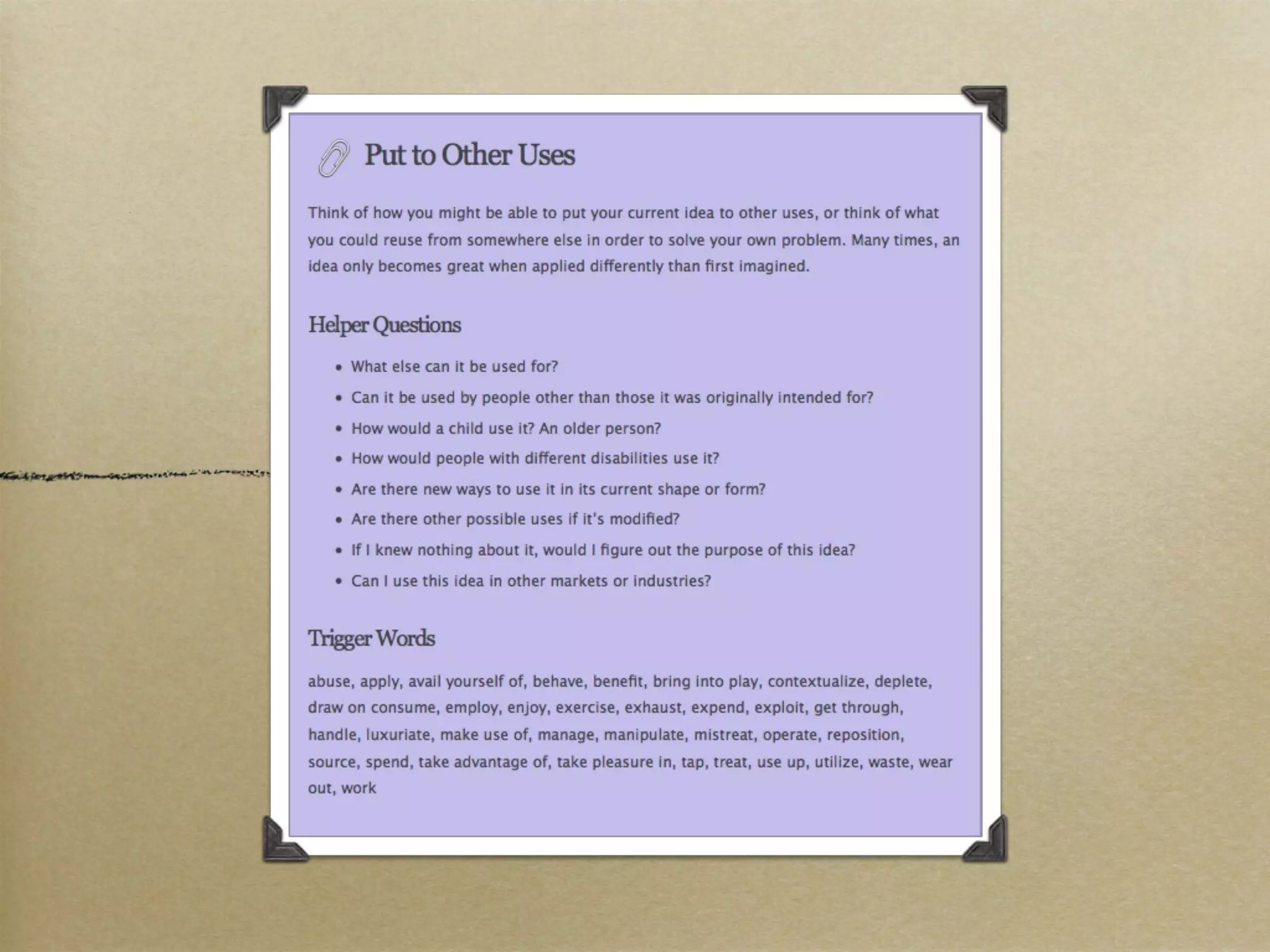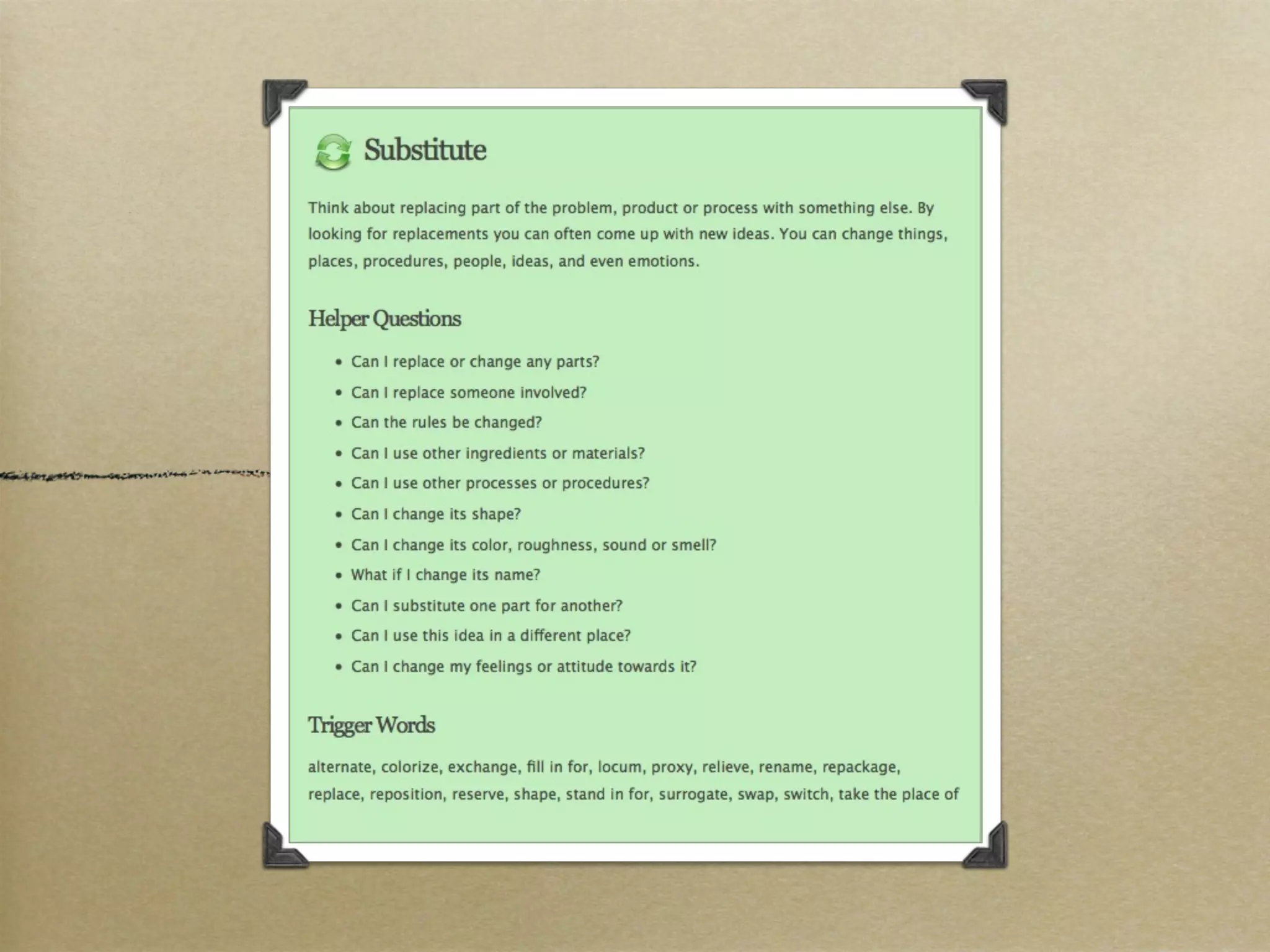 This document discusses creative thinking strategies and techniques for problem solving. It introduces the idea generation, implementation, and selection phases of problem solving processes. It then describes the SCAMPER technique for stimulating ideas, which involves substituting, combining, adapting, magnifying, putting to other uses, eliminating/minimizing, and rearranging elements of a process or object. The document provides examples of applying SCAMPER to generate new ideas for managing time and washing a car.