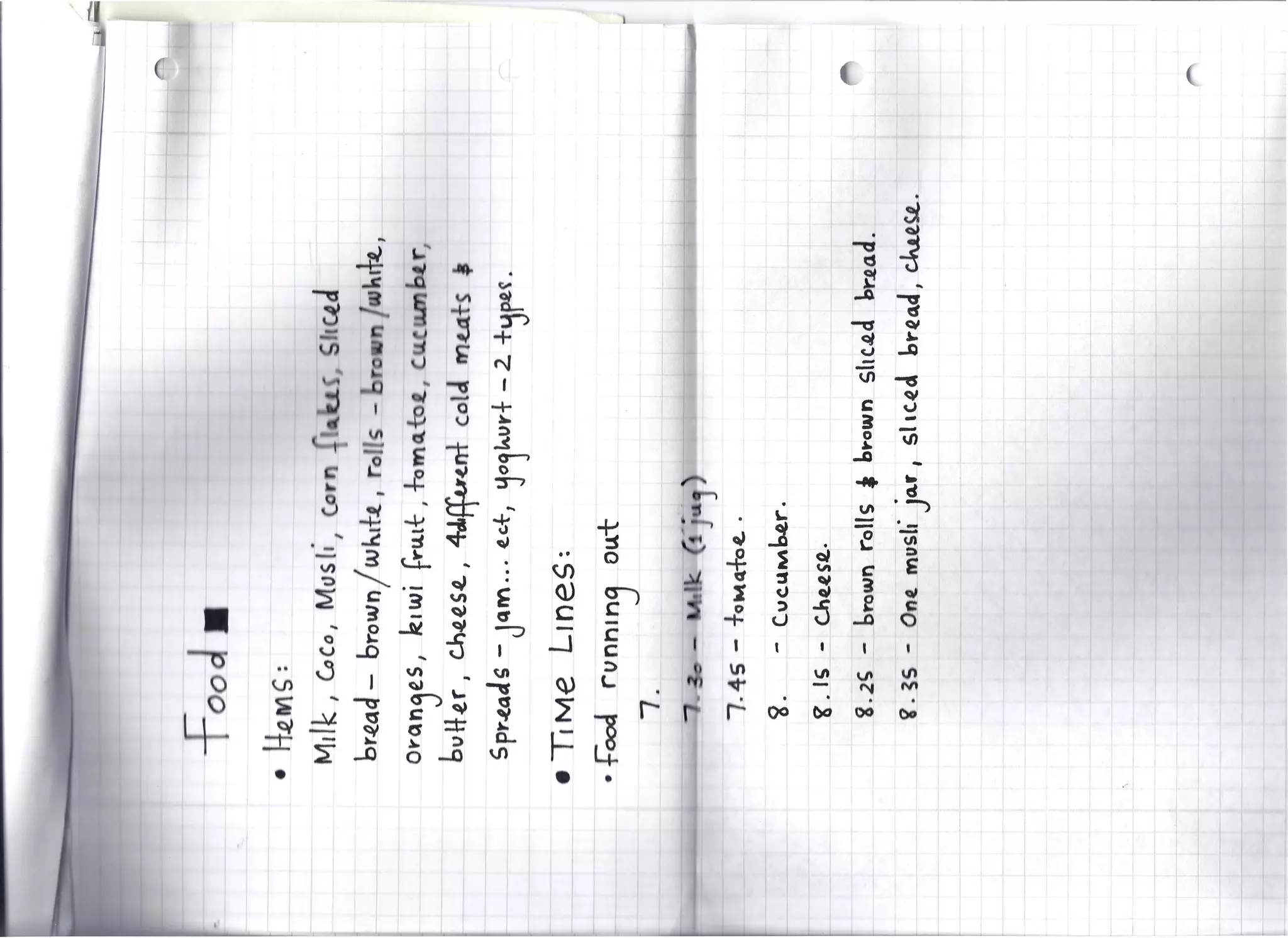 This document appears to be a grocery list and timeline for making a sandwich. It includes ingredients like milk, fruit, oranges, butter, cheese, and cucumbers. The timeline shows when certain ingredients would run out, such as milk at 7am and cucumbers at 7:15am. Making the sandwich is scheduled between 8:20am and 8:25am and involves brown rolls, brown shredded bread, one mushroom, car sliced bread, cheese.