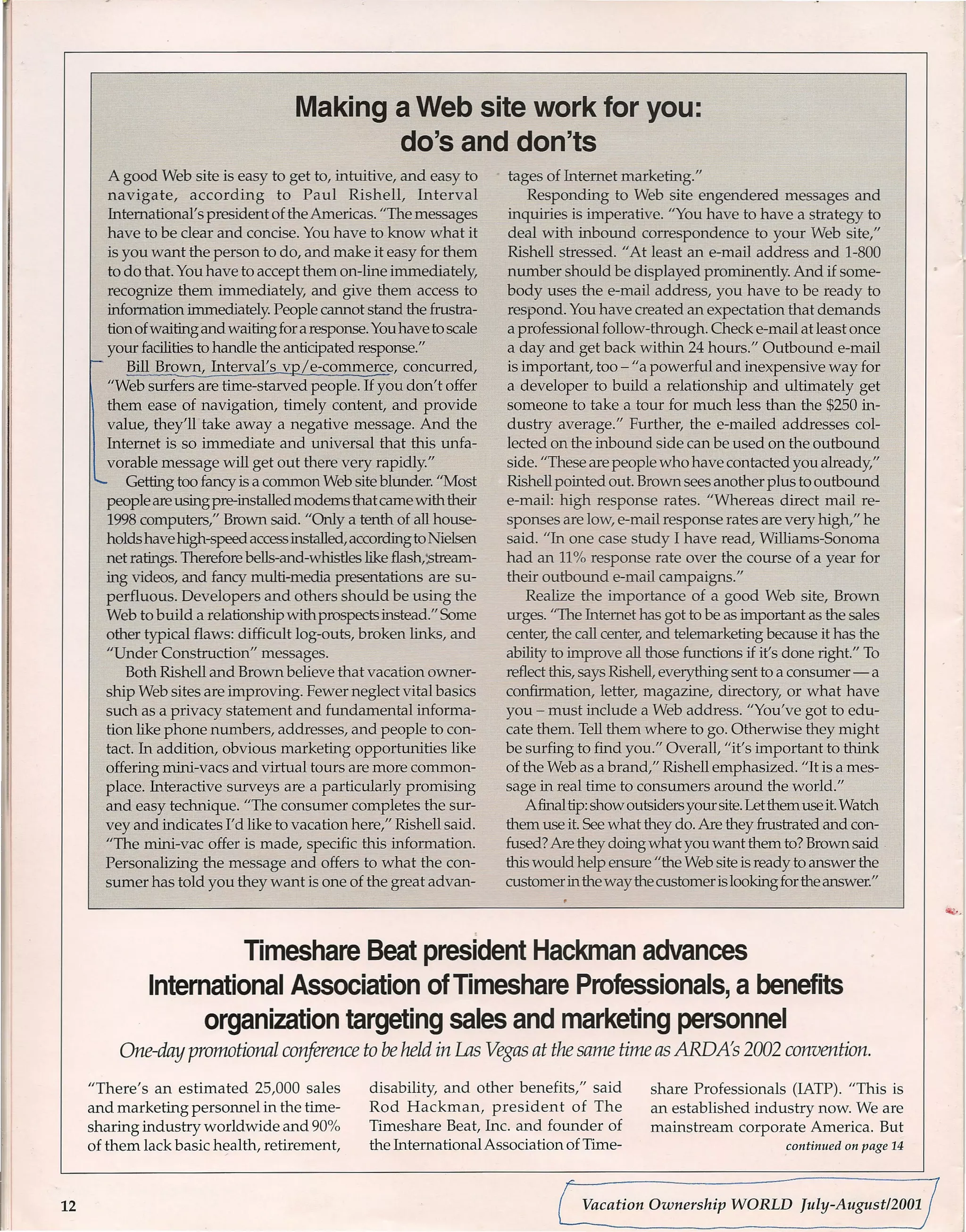 The document discusses best practices for creating an effective vacation ownership website. It recommends that websites be easy to navigate, provide clear and concise messages, and respond to users immediately. Websites should also provide basic contact information and functionality like virtual tours and surveys. The document emphasizes testing websites with outsiders and ensuring the site answers users' questions in an intuitive way. Responding to inquiries from the website is also important to build relationships with potential customers.
