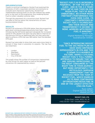Rocket Fuel was hired by Scandinavian Airlines (SAS) to increase flight bookings and achieve a positive return on investment. Initially using only prospecting new audiences, Rocket Fuel delivered a cost per acquisition (CPA) 63% better than the goal. Based on this success, SAS then had Rocket Fuel implement retargeting to utilize its full-funnel approach, and the monthly spend increased 72%. Through artificial intelligence and tracking pixels, Rocket Fuel analyzed user attributes and behaviors. This allowed Rocket Fuel to lower the CPA further, achieving a CPA 38% better than the blended goal. Key results showed users near airports were more likely to convert.