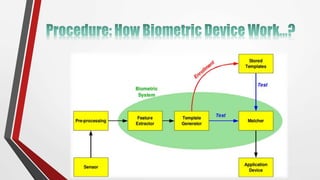 Biometrics uses measurements of biological characteristics to identify individuals. Common biometric scanning devices include face scanners, hand scanners, fingerprint scanners, iris/retina scanners, and voice analyzers. Iris and retina scanners are generally the most secure as the iris and retina cannot be duplicated, while voice recordings can bypass voice analyzers. Emerging research is exploring biometrics based on brain and heart signals, which could provide even more secure identification.