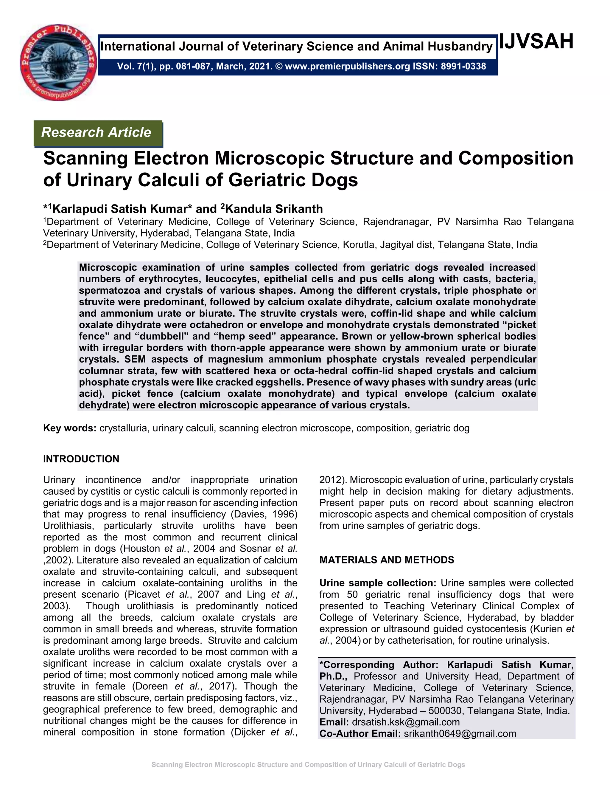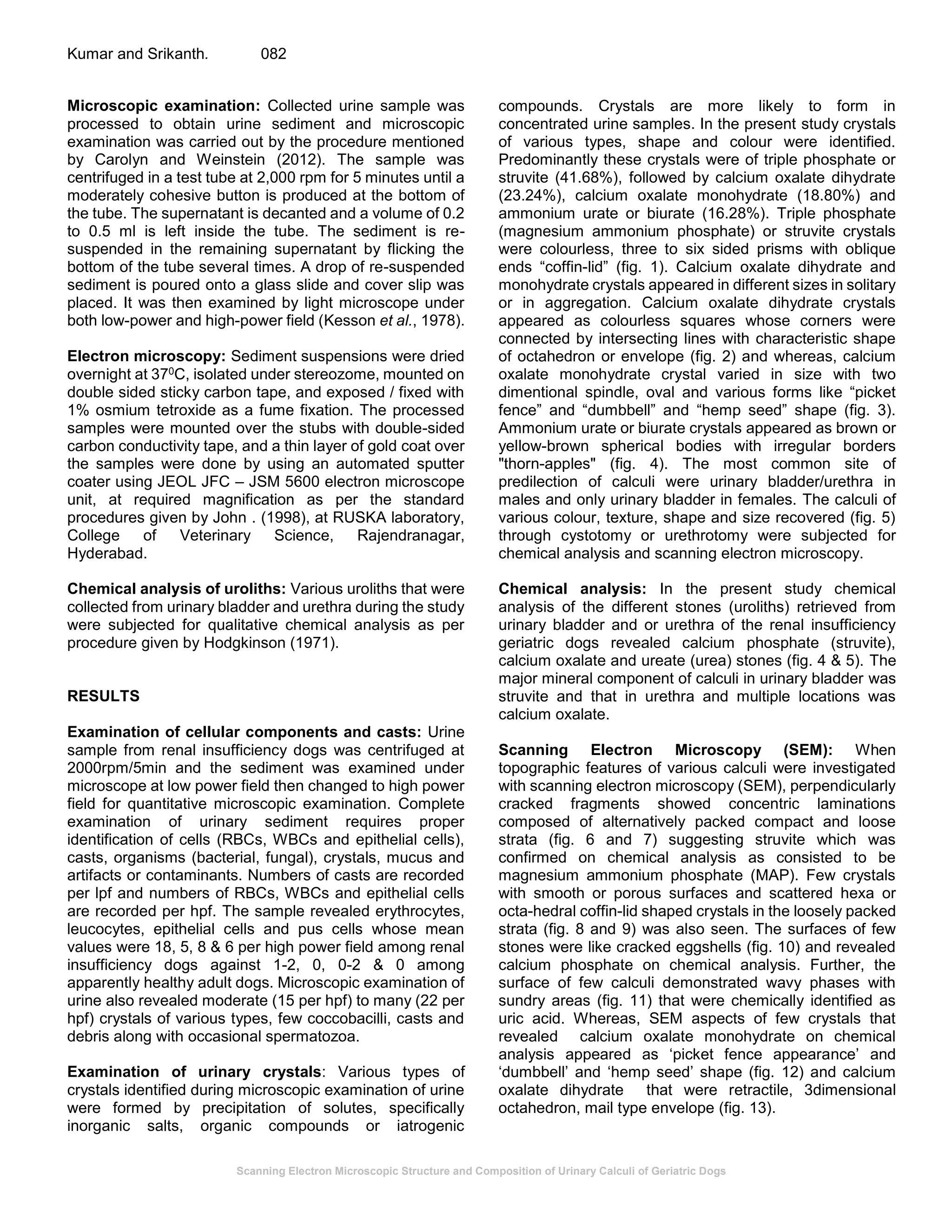 This document summarizes a study on the scanning electron microscopic structure and chemical composition of urinary calculi (stones) found in geriatric dogs. Microscopic examination of urine samples revealed increased numbers of blood cells, epithelial cells, pus cells, casts, bacteria and crystals of various shapes, predominantly struvite, calcium oxalate dihydrate and monohydrate, and ammonium urate. Scanning electron microscopy showed perpendicular columnar strata of struvite crystals and wavy phases of uric acid. Chemical analysis identified calcium phosphate, calcium oxalate and urea stones. The study characterized the microscopic and electron microscopic appearance of crystals and chemical composition of urinary calculi in geriatric dogs.