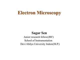 The document summarizes electron microscopy. It describes how electron microscopy works by using a beam of electrons instead of light to image specimens. It discusses the main components of a scanning electron microscope, including the electron gun, electron lenses, and detectors. It also explains how scanning electron microscopes function by scanning a focused electron beam over a sample to produce signals containing information about the sample's surface topography and composition.