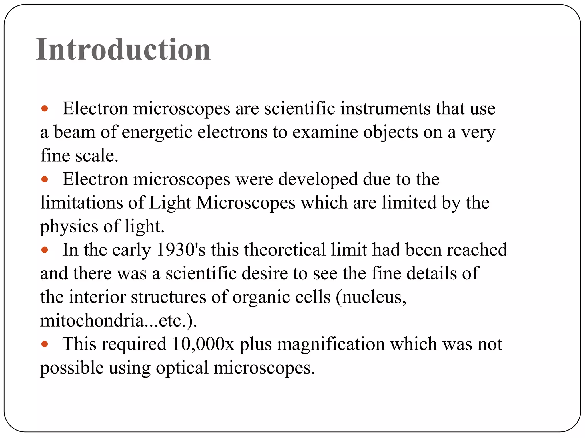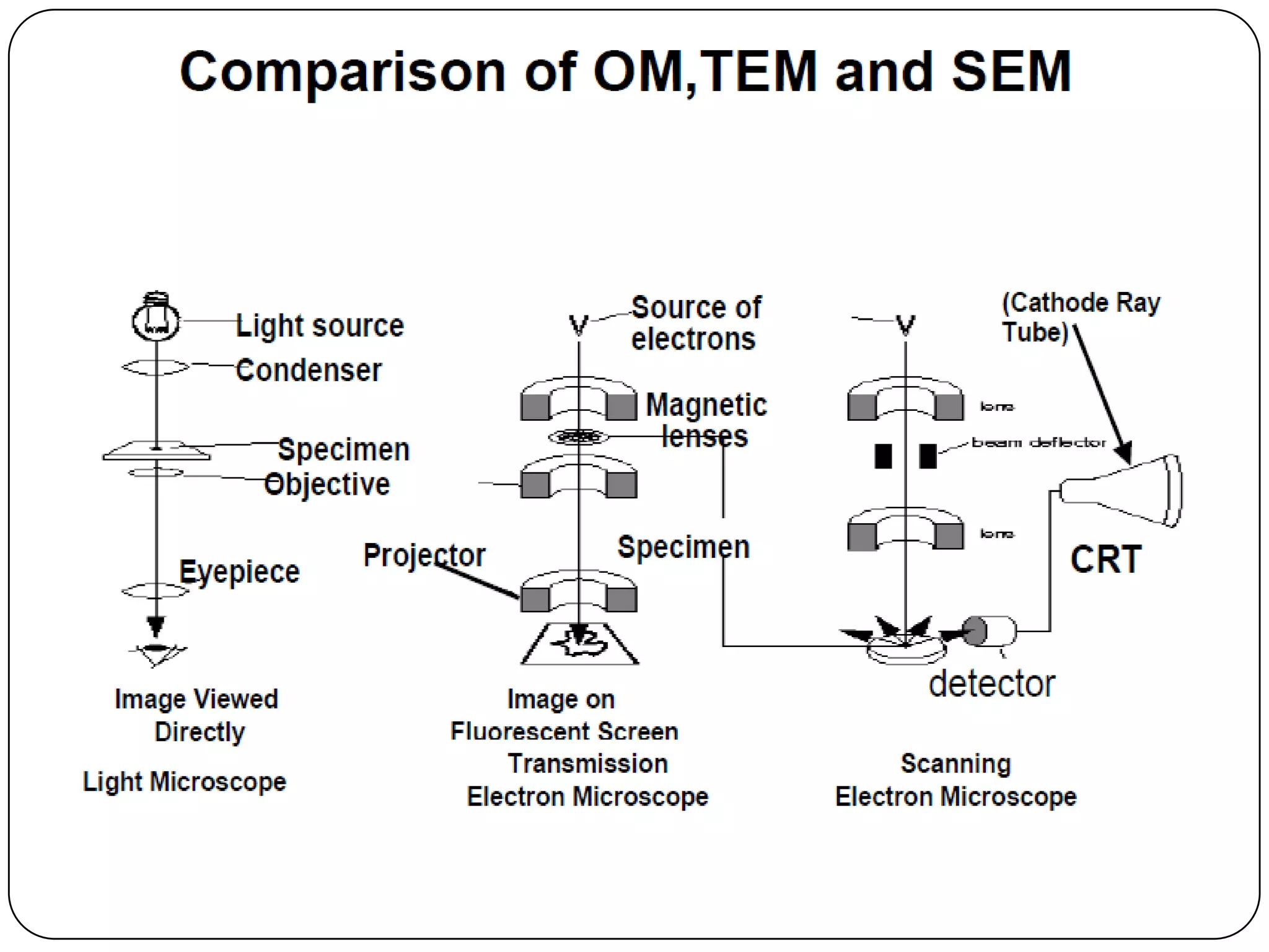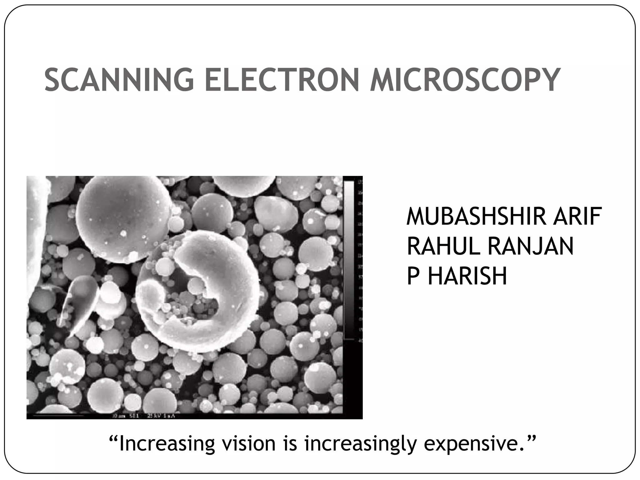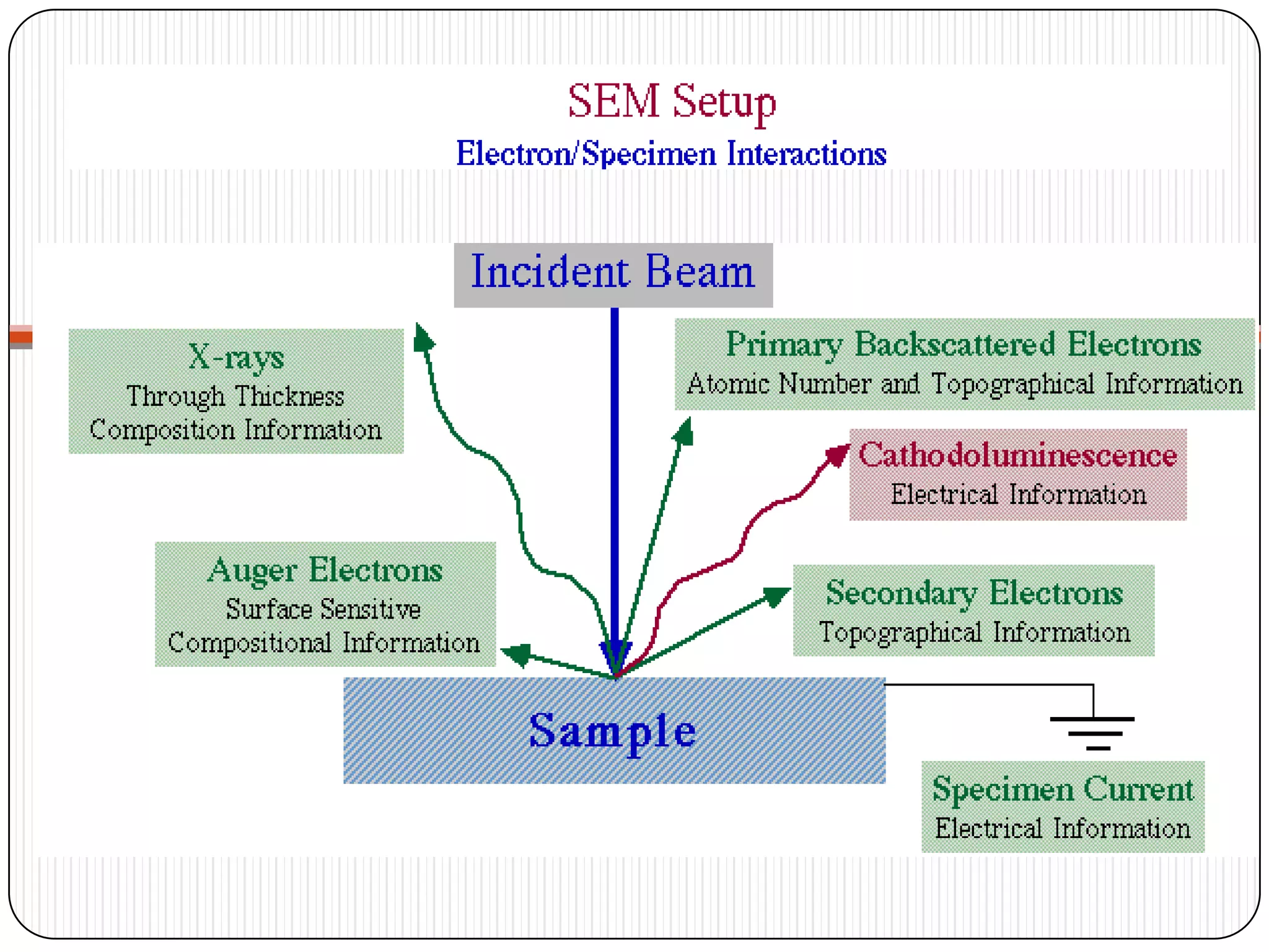 This document provides an overview of scanning electron microscopy (SEM). It discusses how SEM works by using a beam of electrons to examine objects at a very fine scale, with greater resolving power than light microscopes. The first SEM debuted in 1938. SEM can provide information about a sample's topography, morphology, composition, and crystal structure. Diagrams show the major components of an SEM, including the electron gun and various detectors. Imaging modes like secondary electron and backscattered electron are described. Applications and limitations of SEM are also summarized.