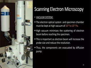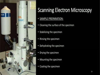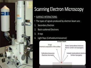 Electron microscopes utilize a beam of energetic electrons to examine objects, overcoming the limitations of light microscopes. They are categorized into scanning electron microscopy (SEM), transmission electron microscopy (TEM), and others, allowing for high magnification and detailed analysis of surface features, morphology, composition, and crystallography. SEM is particularly versatile for studying non-metallic and biological materials without the need for coating, and it is widely used in forensic analysis.