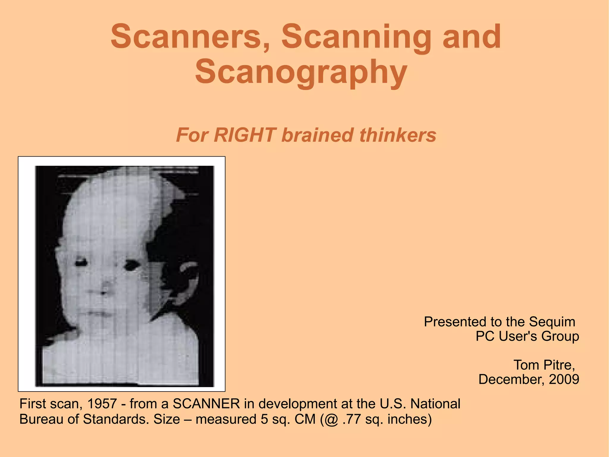 The document discusses various aspects of scanners, including their history, functionality, and different uses such as scanning documents, images, and objects. It provides technical insights into scanning resolutions, formats, and settings, as well as practical tips for effective scanning techniques. Additionally, it includes references and links for further information on scanning practices and recommendations.