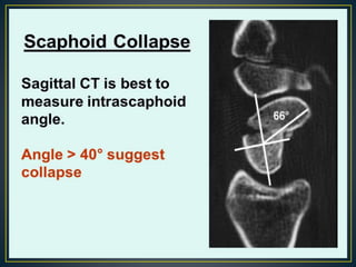 The scaphoid bone is located in the wrist and is vulnerable to injury due to its position. It has a tenuous blood supply and reduced healing capacity. Scaphoid fractures are difficult to diagnose on initial imaging and occur most commonly at the waist of the bone. Treatment depends on fracture pattern and stability, with nondisplaced fractures typically treated non-operatively with casting and displaced or unstable fractures often requiring surgical fixation. While casting results in immobilization, surgical treatment allows for earlier rehabilitation and return to activity.