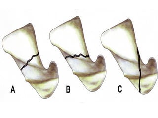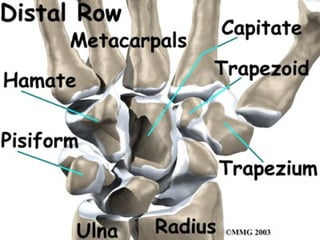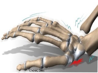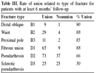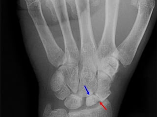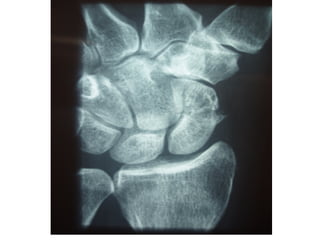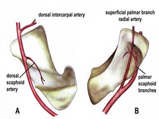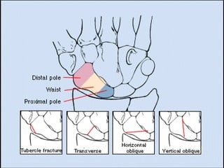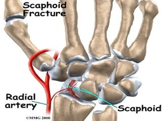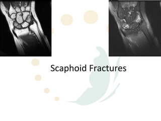 Scaphoid fractures are the most common carpal bone fractures, often occurring in young adults from falls on an outstretched hand. The scaphoid has a tenuous blood supply and is prone to non-union, especially for proximal pole fractures. Treatment depends on fracture type and stability, ranging from casting to operative fixation with screws. Complications include malunion, delayed union, non-union and avascular necrosis, requiring further procedures like bone grafting or carpal fusion.