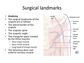 This document describes the scapular flap procedure. It details the relevant surgical landmarks and arterial system around the scapula. The flap can include skin, muscle, and bone from the scapula region. The flap is designed and harvested by following the path of the circumflex scapular artery. For a bone flap, the periosteal branch is dissected to access bone from the lateral border of the scapula. The scapular flap provides a large volume of soft tissue and bone to reconstruct significant defects, such as after extensive maxillectomies or mandibular resections.