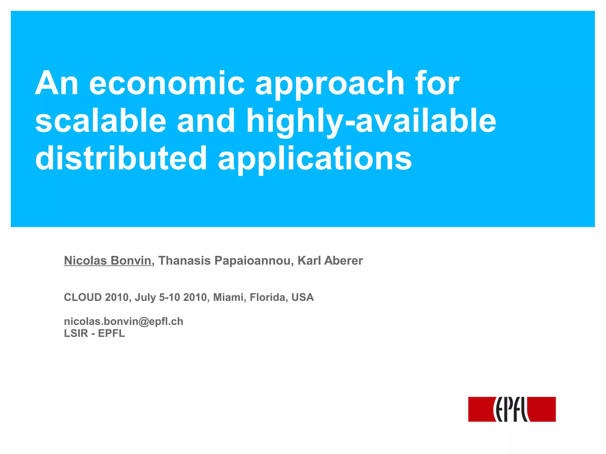 This document presents an economic approach for scalable and highly-available distributed applications called Scarce. Scarce uses an agent-based architecture where each server runs an agent that communicates with other agents to make decentralized placement decisions. Components are placed based on balancing performance, availability, and load. Components pay virtual rent to servers based on resources used, and servers charge rent. Rents are gossiped between agents with no central authority. The approach dynamically replicates, migrates, or removes components to optimize for availability and load balancing as resources and demand change over time. Evaluation shows Scarce outperforms static placement in adapting to new resources and workloads, and provides fairness between applications sharing cloud resources.