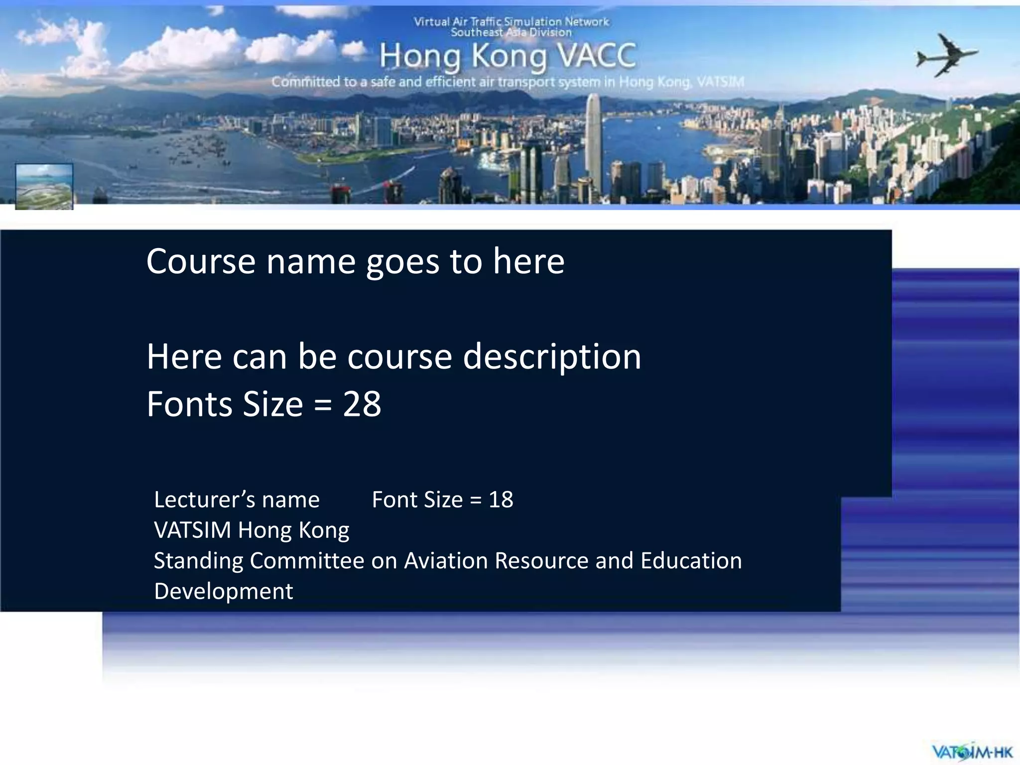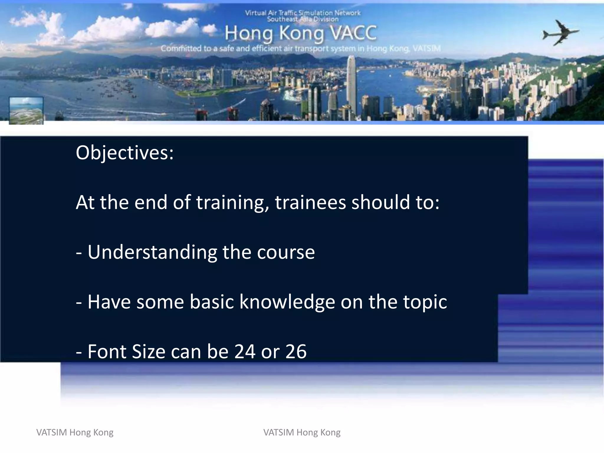 This document appears to be a training presentation that includes information about the course name and description, objectives of the training, contact information for the organization hosting the training, and an outline of topics to be covered. The presentation provides guidance on appropriate font sizes to use for various sections and specifies the objectives of the training are for trainees to understand the course, have basic knowledge of the topic, and understand the foundation and control surfaces of aircraft. It also includes a list of participant names and closes with a restatement of the contact information.