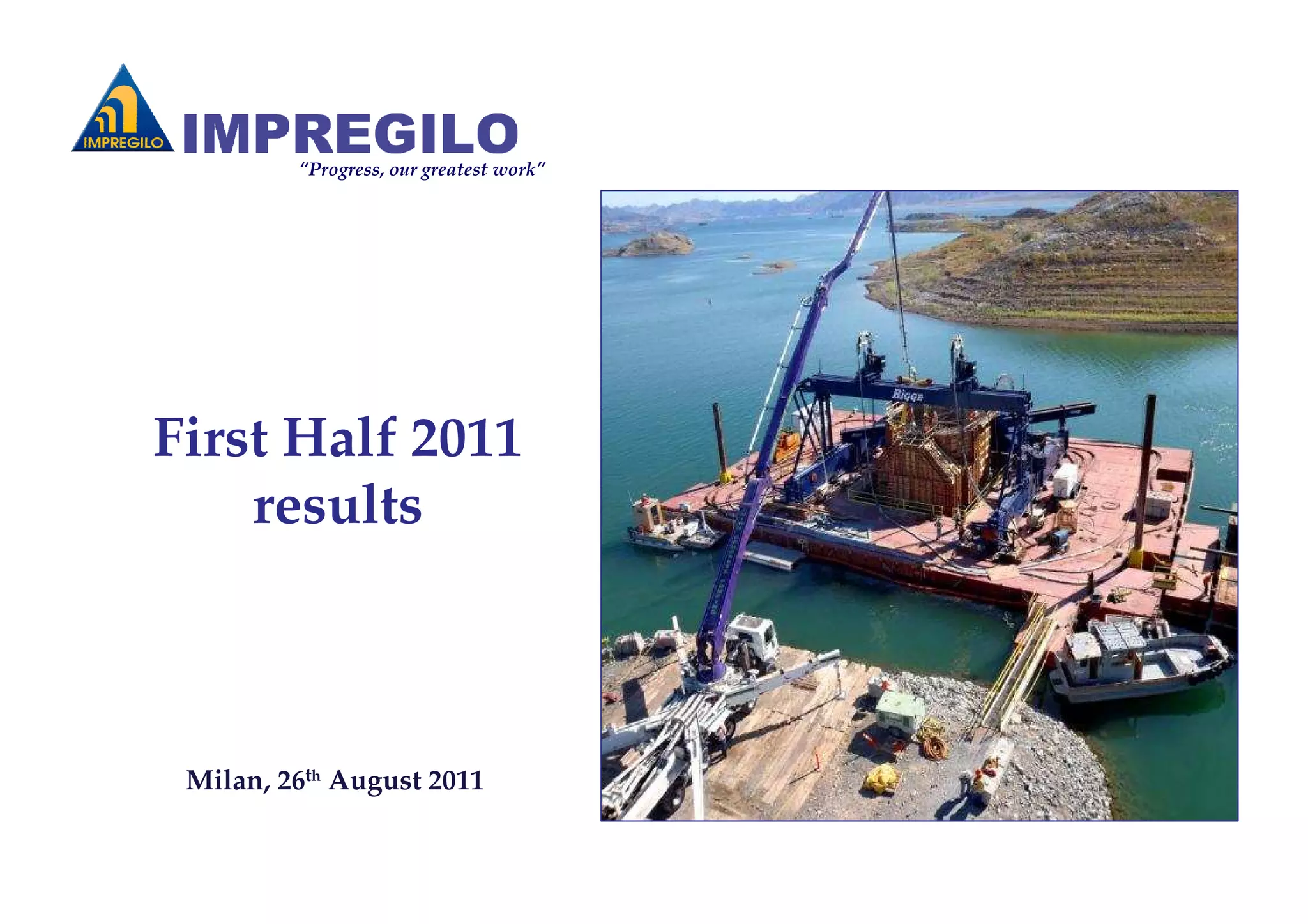 The document provides financial and operational highlights for Impregilo for the first half of 2011. It summarizes that revenues were €1,004 million, EBITDA was €120 million, and net result was €39 million. It also notes that order acquisition was €860 million and total backlog was €22,740 million. The document outlines Impregilo's operations and projects in various sectors including construction, concessions, and engineering.