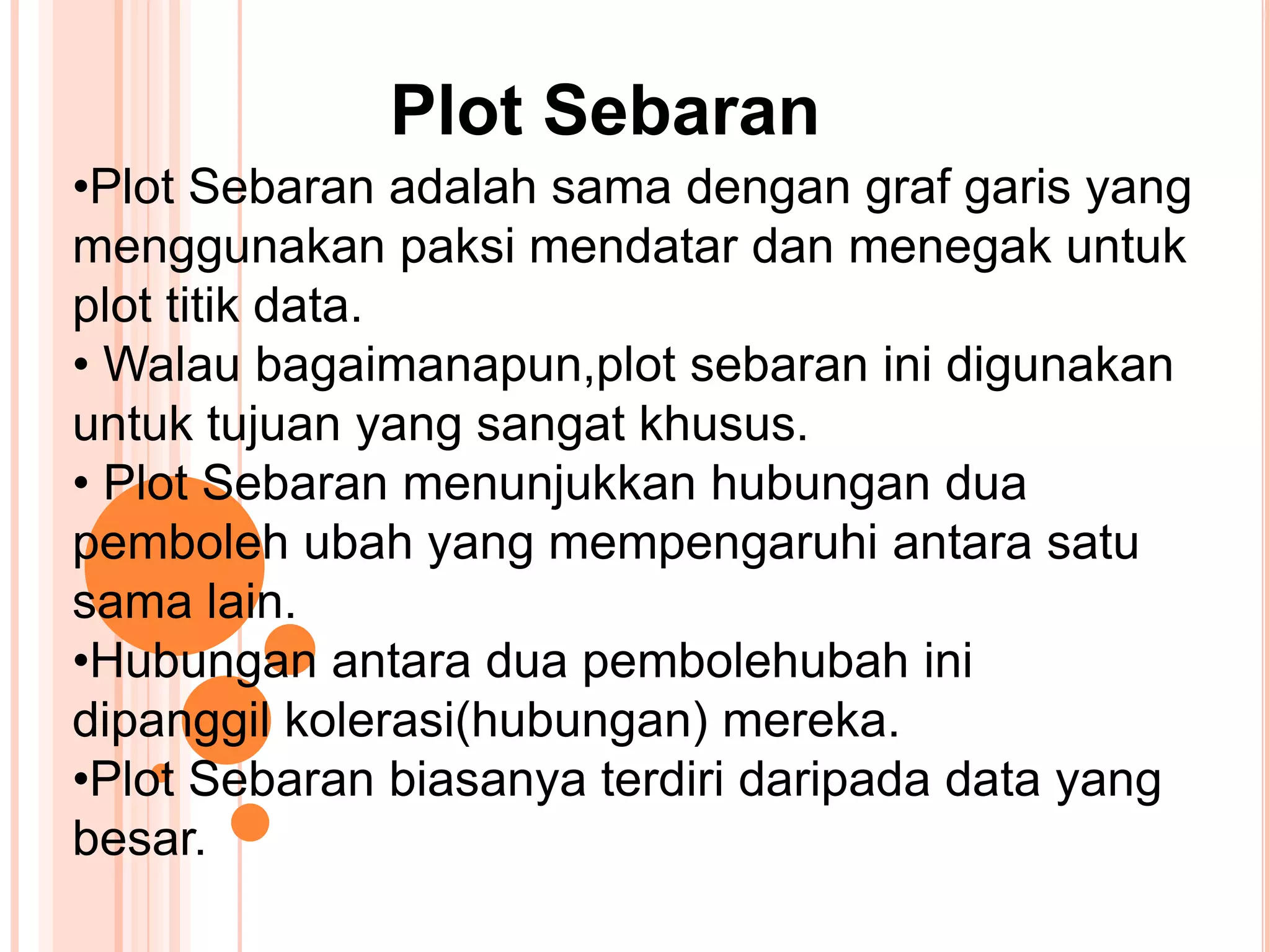 Plot sebaran menunjukkan hubungan antara dua pemboleh ubah dengan menggunakan graf garis. Ia menentukan sama ada hubungan antara pemboleh ubah tersebut positif, negatif, atau tiada kaitan, bergantung pada taburan titik data. Plot sebaran berguna untuk menganalisis korelasi antara masa belajar pelajar dengan keputusan peperiksaan mereka.