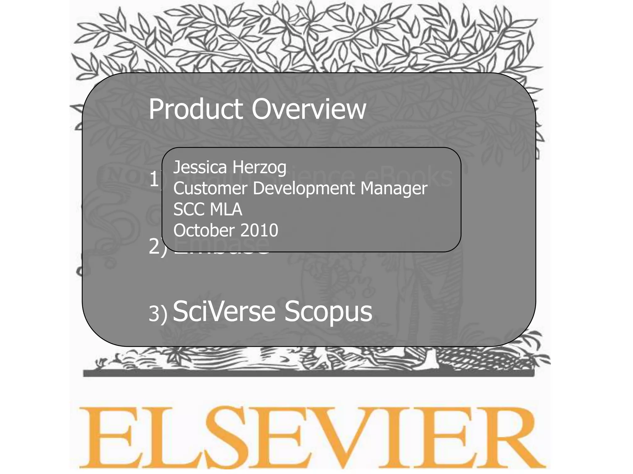 This document provides an overview and summary of Health Science eBooks, Embase, and SciVerse Scopus. It describes the key features and benefits of each product, including over 850 eBook titles in health sciences from imprints like Mosby, Saunders, and Churchill Livingston available on ScienceDirect. It also summarizes Embase as the world's most comprehensive biomedical research tool covering 7,000 journals and SciVerse Scopus as the largest abstract and citation database of peer-reviewed literature with over 22,000 titles.