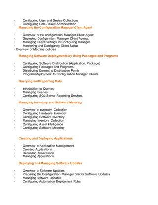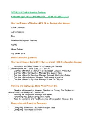 This document provides an overview and agenda for an SCCM 2016-17 administration training which covers topics such as Windows Server 2012 R2, Active Directory, SQL Server, SCCM architecture, site deployment, client management, software and application deployment, inventory management, software updates, endpoint protection, operating system deployment, compliance settings, remote control, maintenance and monitoring, mobile device management, and interview questions. The training will include discussions of SCCM features, comparisons of different versions, site roles, deployment scenarios, and configuration of various SCCM components and capabilities.