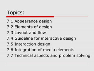 The document discusses principles of application design, including appearance design, elements of design, layout and flow, interaction design, and integration of media elements. It covers topics like visual appearance, website design examples, design elements like lines, shapes, color, typography, and space. It also discusses layout, flow, interaction guidelines, and integrating different media types. The overall document provides an overview of foundational principles for designing effective applications and digital media.