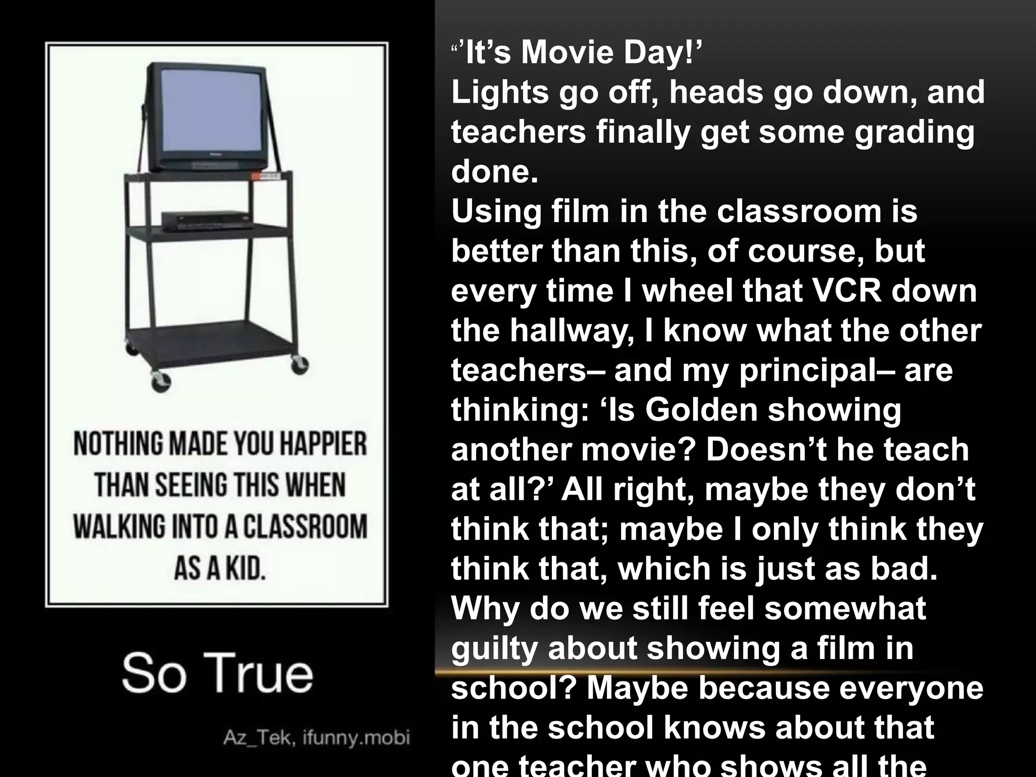 Golden feels somewhat guilty about showing movies in class because teachers are often judged negatively for it. However, movies can be better learning tools than just showing them to occupy students. Great films are equivalent to classic literature in conveying human experiences and should be viewed as educational texts to analyze. Integrating film into the English classroom can help teach common core standards and engage students through a medium they enjoy. Teachers need not feel guilty about using film judiciously to enhance learning.