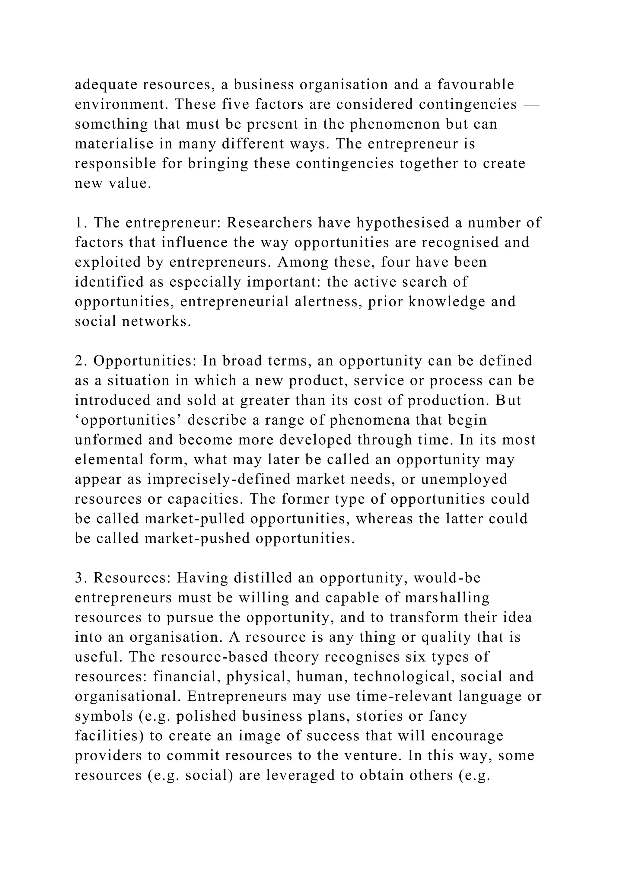 The document explores the multifaceted nature of entrepreneurship, covering its definition, critical elements, stages of new venture formation, and influences on entrepreneurship in different regions, particularly the Asia-Pacific. It emphasizes the importance of individual entrepreneurs, opportunities, resources, and the environment in fostering entrepreneurial activities, as well as the role of government in promoting entrepreneurship through favorable policies. Additionally, the text discusses the education of entrepreneurs, asserting that entrepreneurship can be taught and learned, and highlights key trends affecting entrepreneurship, such as globalization and innovation.