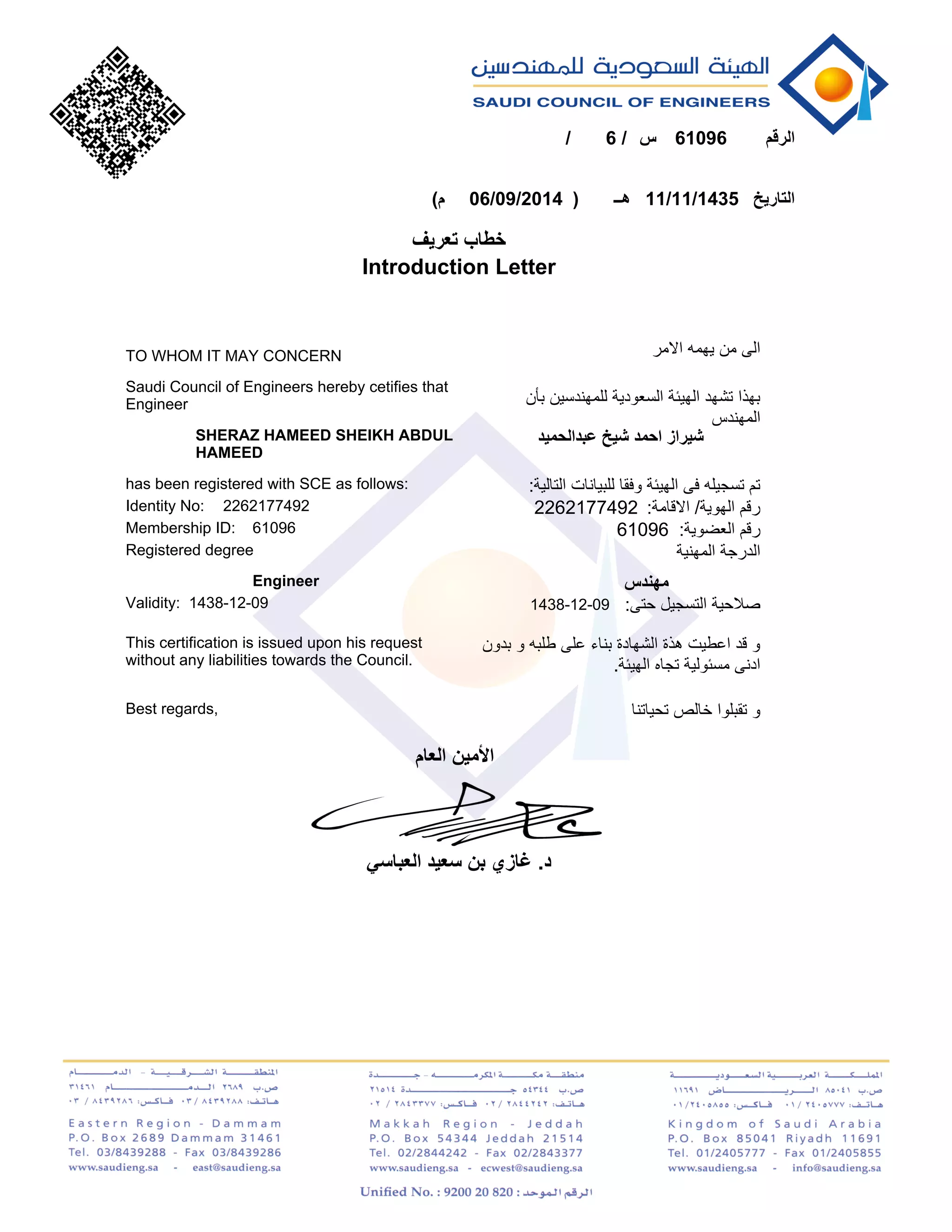This letter certifies that Engineer Sheraz Hameed Sheikh Abdul Hameed with identity number 2262177492 and membership ID 61096 has been registered with the Saudi Council of Engineers as an Engineer. The certification is valid until 1438-12-09 and was issued at his request without any liabilities for the Council.