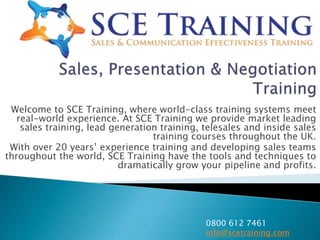 SCE Training offers top-notch sales, lead generation, telesales, and inside sales training across the UK, leveraging over 20 years of global experience to enhance sales teams' performance. The organization focuses on strategic lead generation and effective communication, aiming to help clients increase their pipeline revenue and profits. They provide both standard and bespoke training courses to meet various organizational needs.