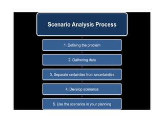 The document discusses scenario analysis and planning in the context of command responsibility in Nigeria. It emphasizes the importance of understanding possible future events for effective decision-making and strategic management, particularly in uncertain environments. The paper outlines the nature and stages of command responsibility while highlighting the necessity of scenario-based learning for improving strategic thinking and crisis management.