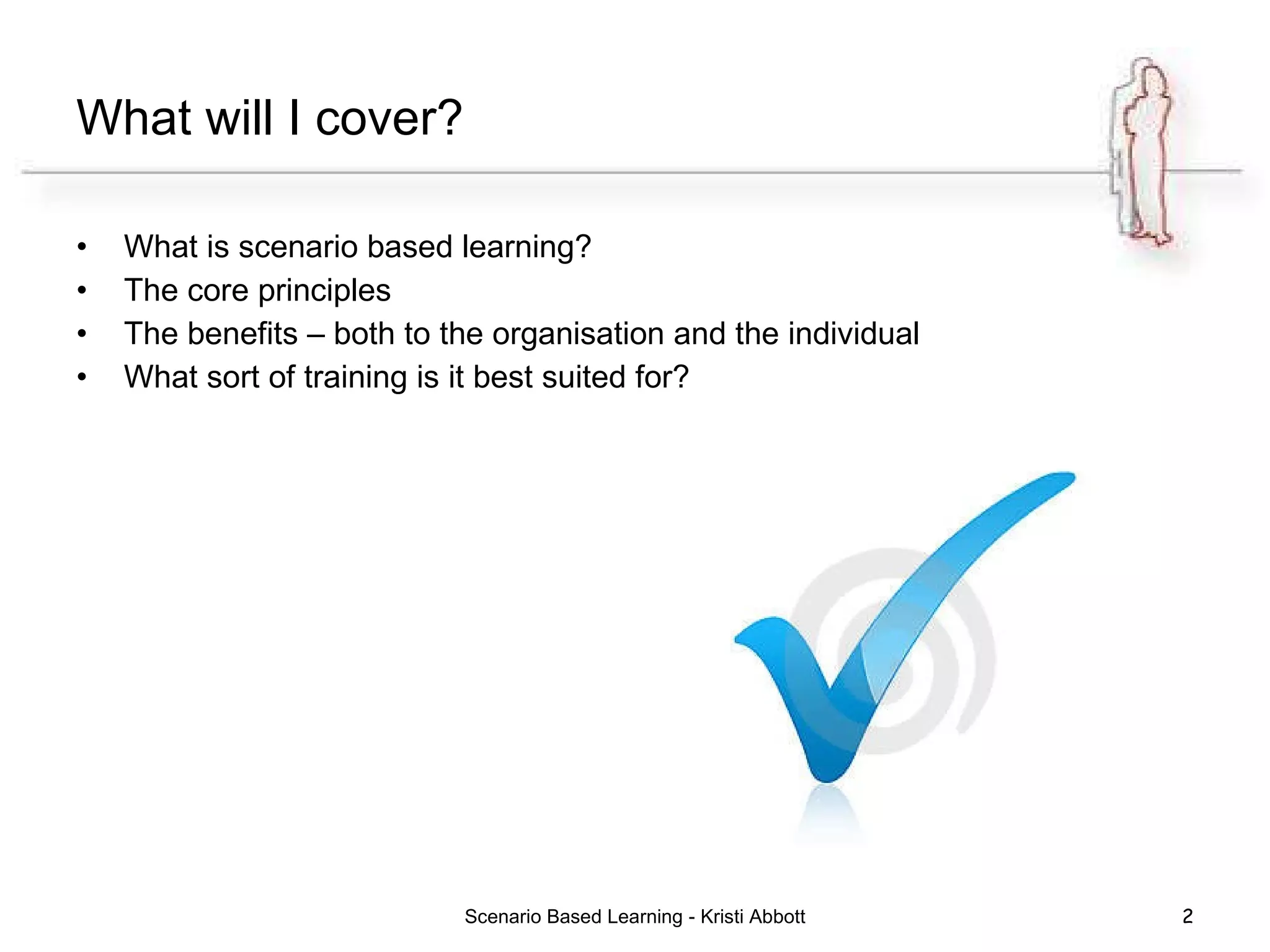 2) The core principles of scenario based learning include using characters that face challenges, showing rather than telling, making it conversational, focusing on design over technology, leading with activities, and ensuring application over memorization.